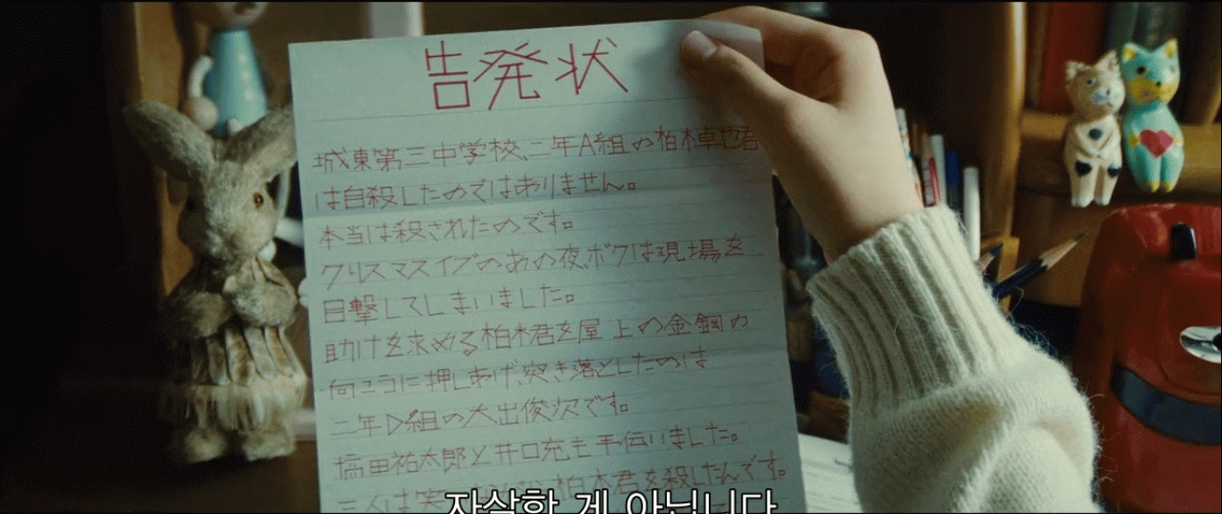 "선생님들도 경찰분들도 고발장 발신자를 감싸주고 있었죠. 하지만 그 사람의 얘기를 제대로 들어주긴 했나요? 고발장 발신자가 정말로 원했던 건 감싸주는게 아니에요. 믿어달라고 호소하는 거죠."
