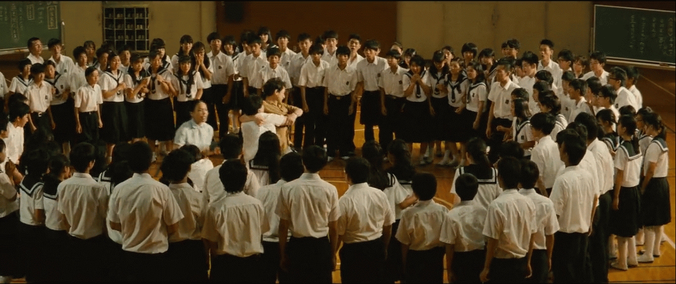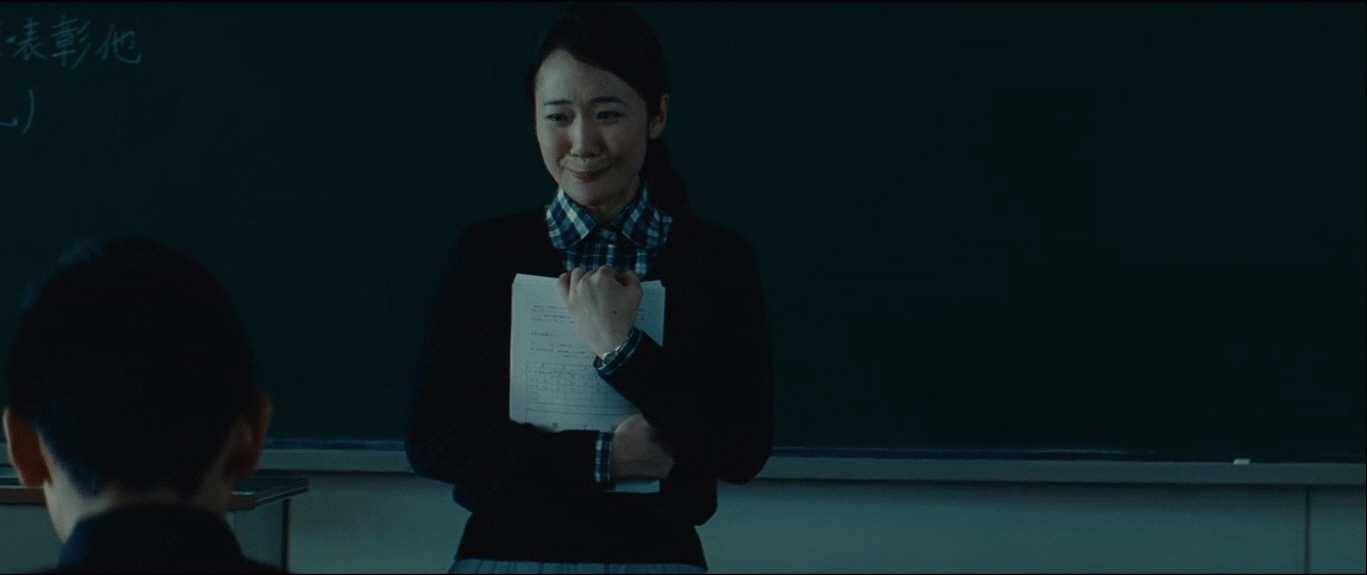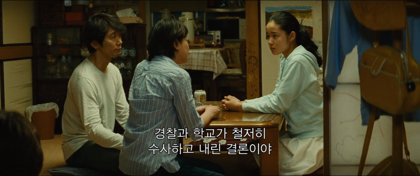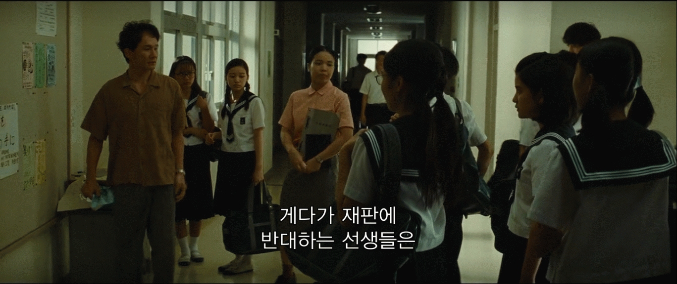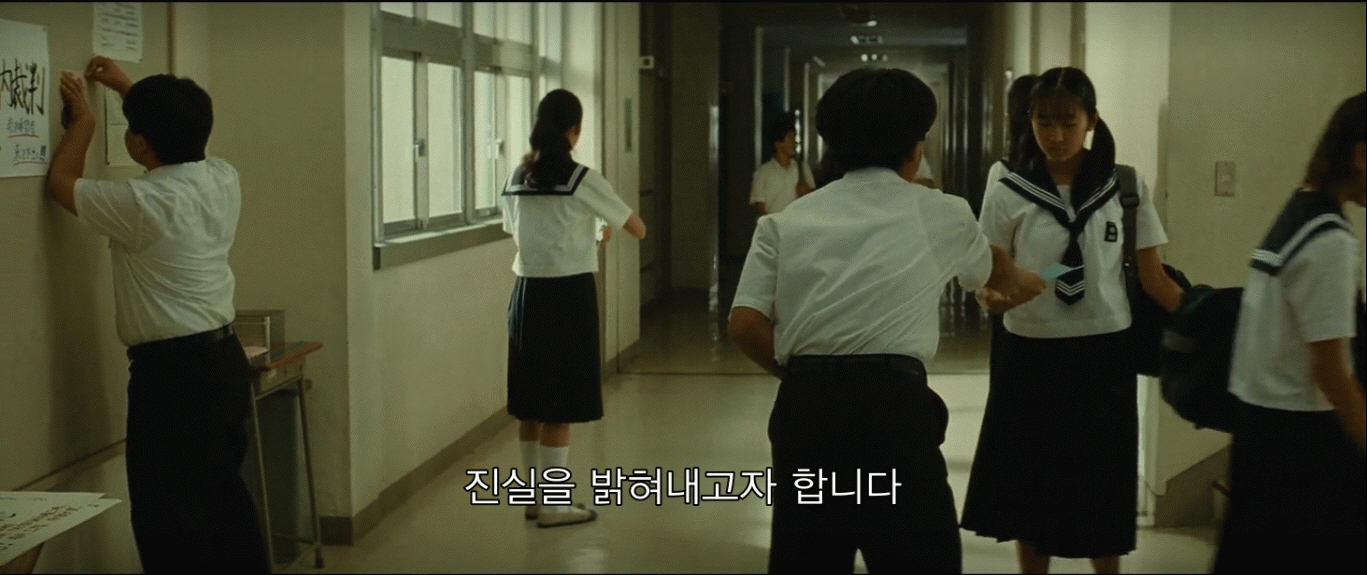 교장이 덮으려고 했던 고발장의 존재는 다른 교사들도 알게 된다. 선생 쿠스야마(파란옷)는 고발장의 존재를 숨긴 교장을 못마땅해 하고 믿지 못한다. 고발장을 찢은 담임 에미코도 마찬가지다. 에미코가 자신은 고발장을 받은 적이 없다고 눈물로 호소하지만, 쿠스야마와 학생주임 타가기는 그 말을 믿지 않는다.