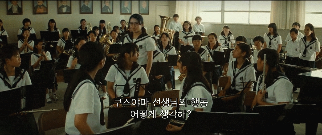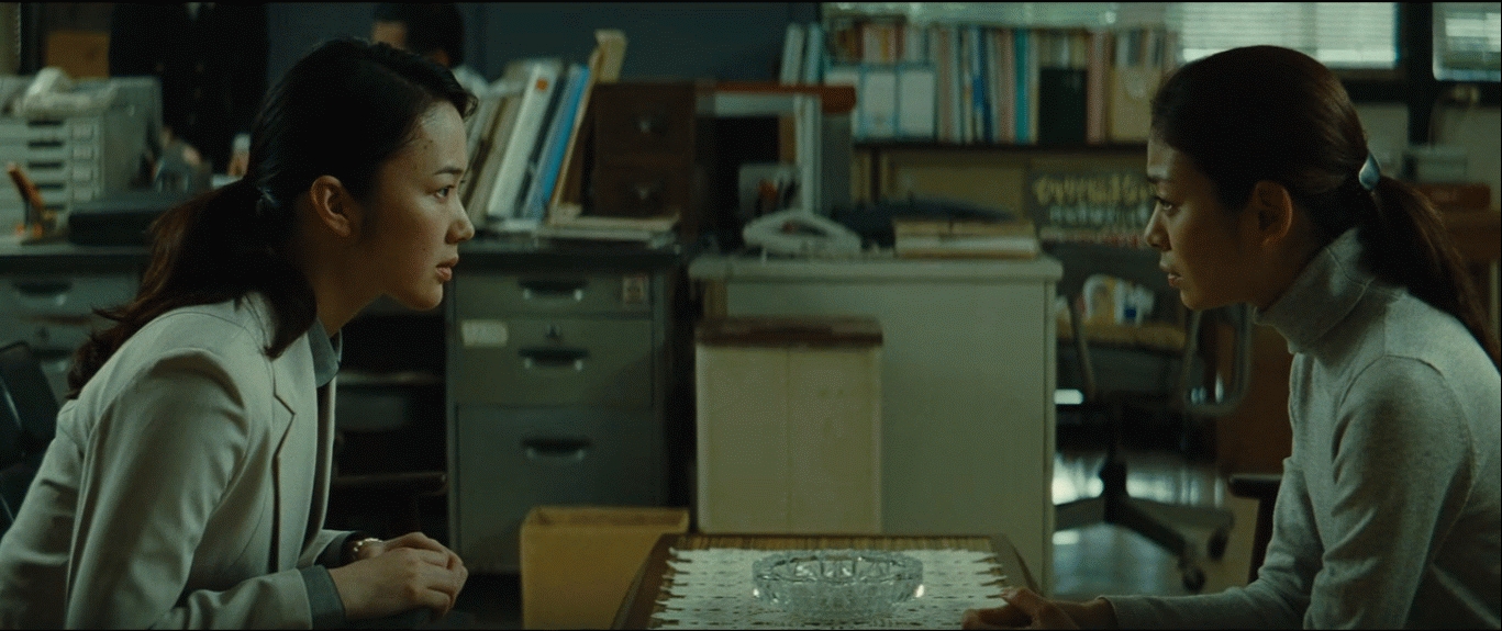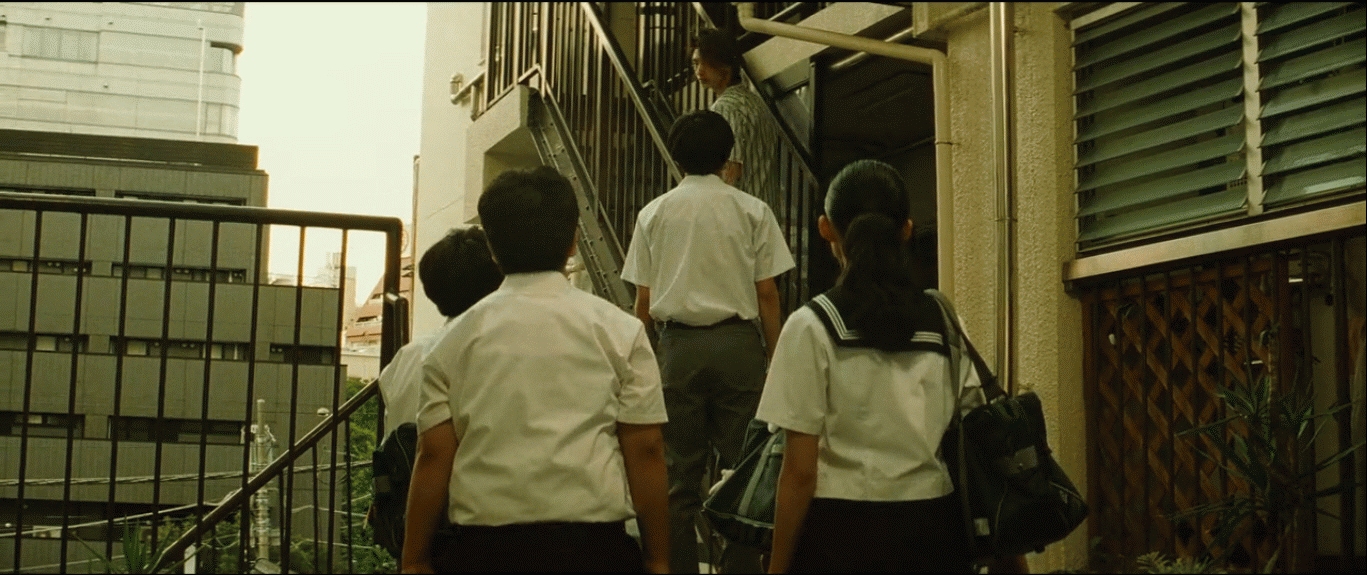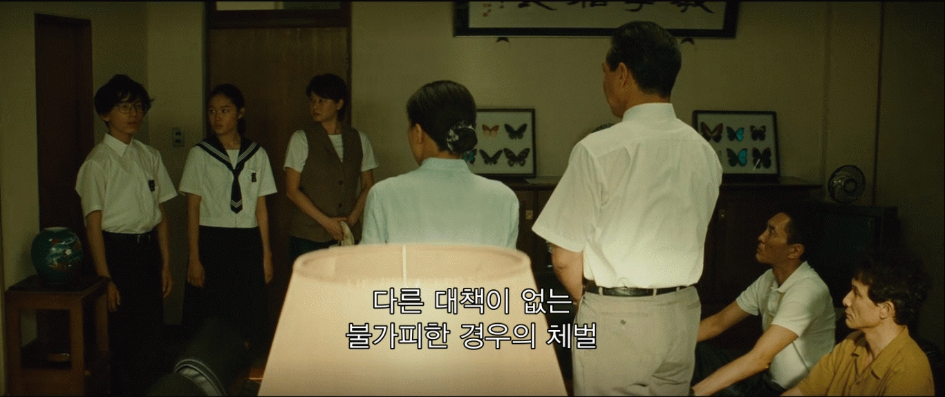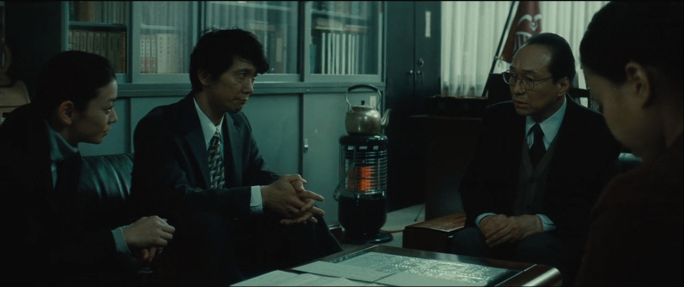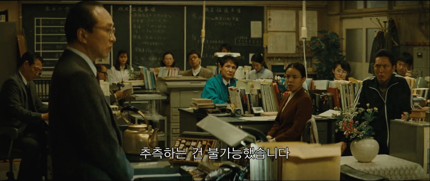 교장이 덮으려고 했던 고발장의 존재는 다른 교사들도 알게 된다. 선생 쿠스야마(파란옷)는 고발장의 존재를 숨긴 교장을 못마땅해 하고 믿지 못한다. 고발장을 찢은 담임 에미코도 마찬가지다. 에미코가 자신은 고발장을 받은 적이 없다고 눈물로 호소하지만, 쿠스야마와 학생주임 타가기는 그 말을 믿지 않는다.