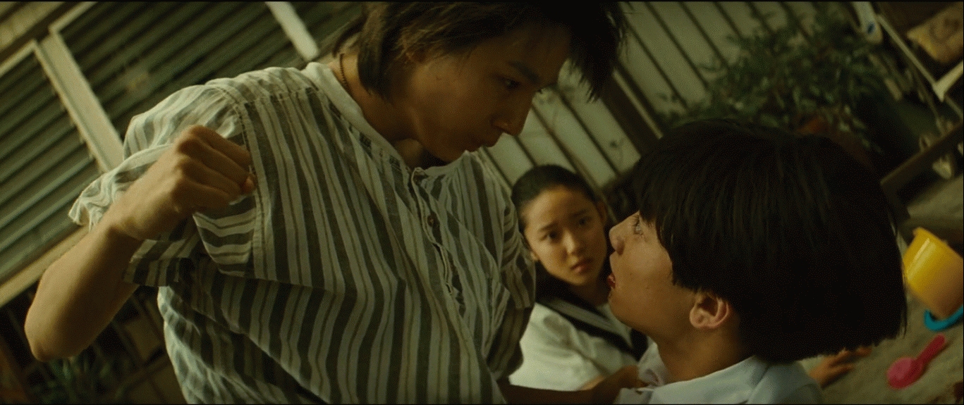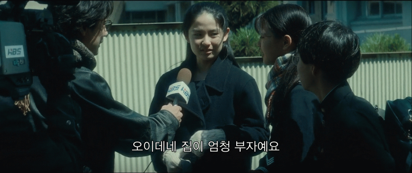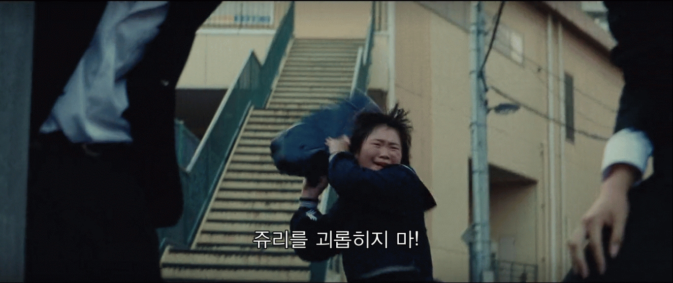 그도 그럴 것이 오이데 패거리가 정말 무개념에 하는 짓거리가 눈 뜨고 봐줄 수가 없다. 과거 오이데 패거리는 쥬리가 계단을 지나가려 하자 쥬리의 여드름을 놀리고 때린 적이 있다. 근데 그 정도가 굉장히 심하다. 가방으로 얼굴을 치는 건 물론이고 발로 등을 차고 심지어 얼굴까지 발로 차버린다. 그걸 본 마츠코가 말리려하자 마츠코까지 같이 때리며 괴롭힌다. 웃으면서 구타를 행사하는데 영화 보다 열 받아서 죽을 뻔했다. 쥬리와 마츠코가 그만하라며 울며 소리지르고, 주위에 도움을 요청해도 오이데 패거리는 그만두지 않는다. 쥬리에게 더럽게 생겨서 죄송하다고 하라고 시킨 후에 그 말을 듣고 나서야 간다. 이만하면 왜 쥬리가 그렇게 피부와 여드름에 민감해했는지 이해가 된다. 여드름때문에 구타를 당하다니. 충격적.