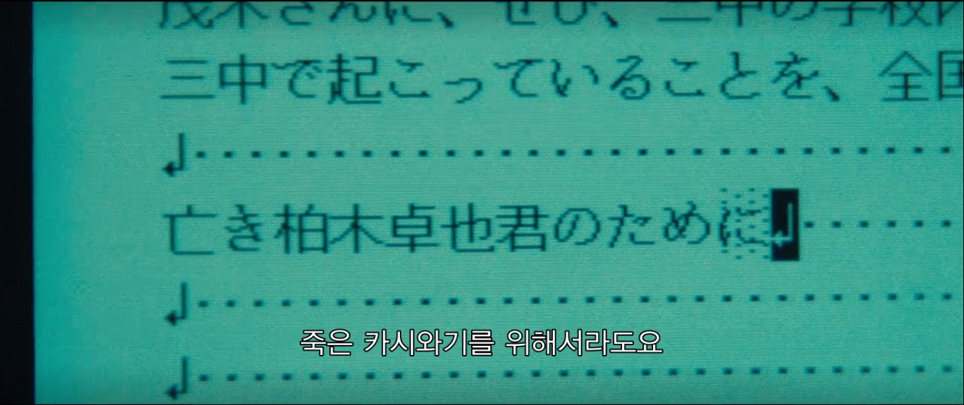 '뉴스 어드벤처 제작부 모기 기자님. 전 이번 교내 재판에 기대를 걸고 있습니다. 드디어 제가 보낸 고발장을 진지하게 다뤄 줄 가능성이 있기 때문입니다. 기자님이 제3중학교의 이번 교내 재판을 꼭 보도해주셨으면 좋겠습니다. 제3중학교에서 일어나는 일을 전국에 알려주세요. 죽은 카시와기 타쿠야를 위해서라도요.'