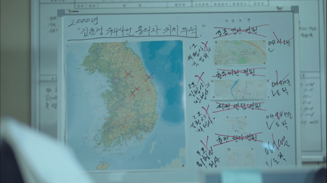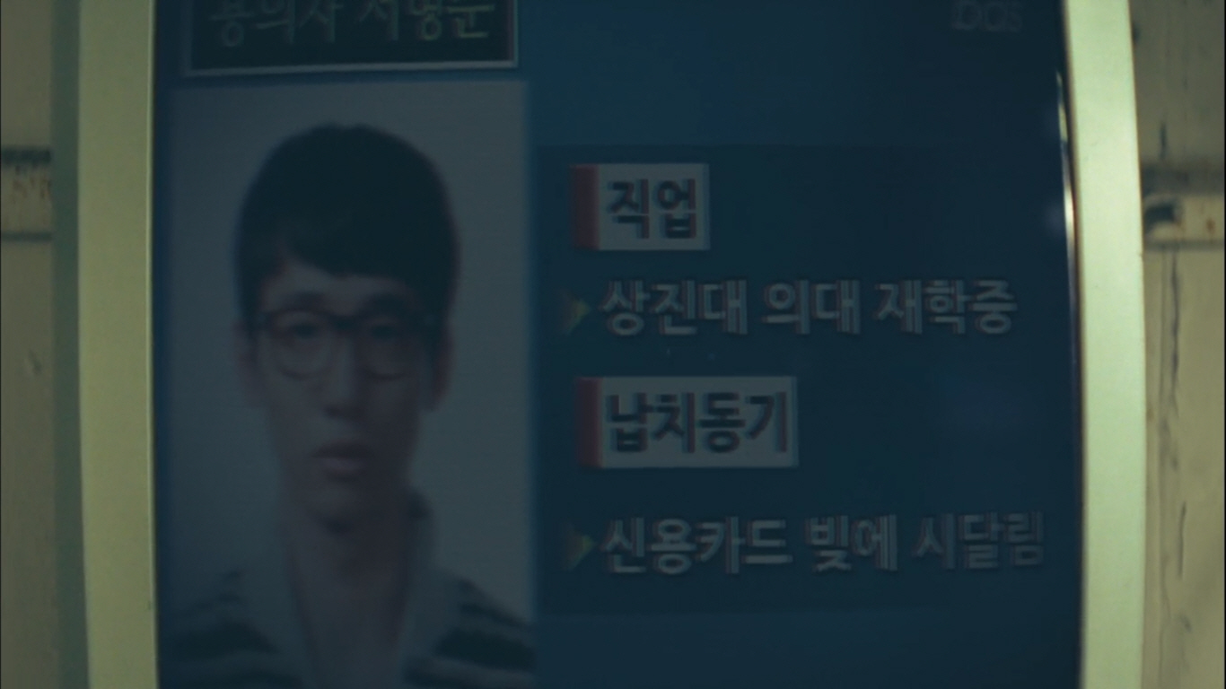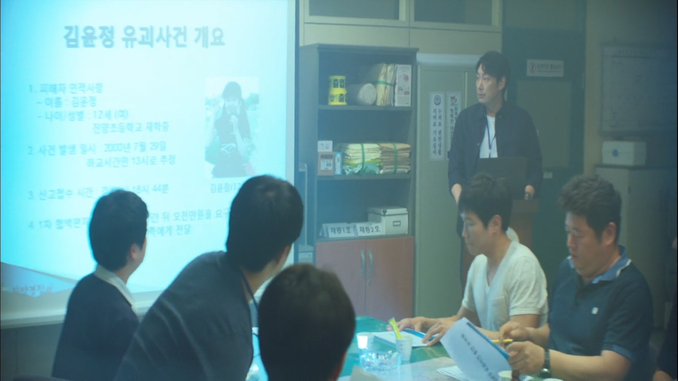 김윤정 유괴사건의 중간 브리핑을 맡은 이재한. 그는 여성이 사용하는 물품과 브랜드가 보이는 서형준의 카드내역서, 서형준 친구의 증언을 토대로 서형준 주변의 여자를 탐문 중이라고 말한다.