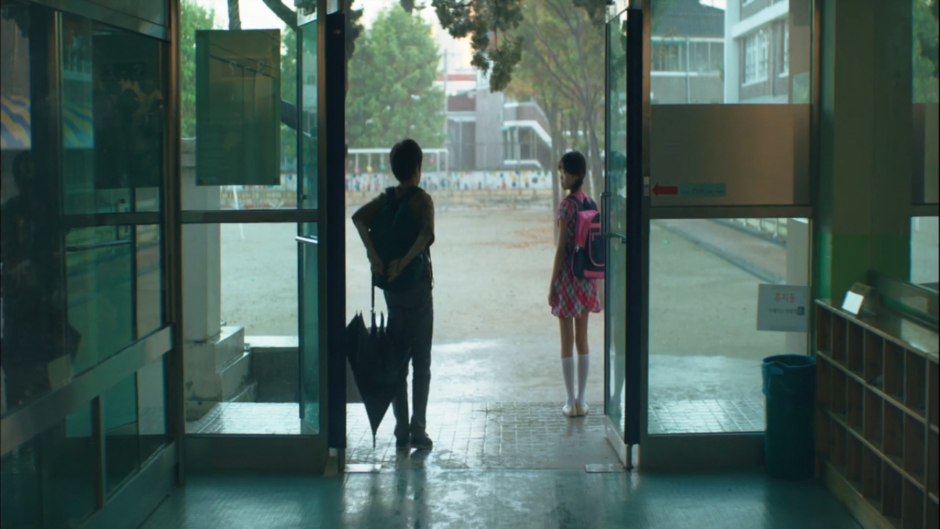 하교길 쏟아지는 비. 해영이는 우산을 가지고 있긴 했지만 망가진 우산이 창피했는지 우산을 들고 비를 맞으며 하교한다. 윤정이는 우산이 없어서 학교 현관에서 기다리는 중.