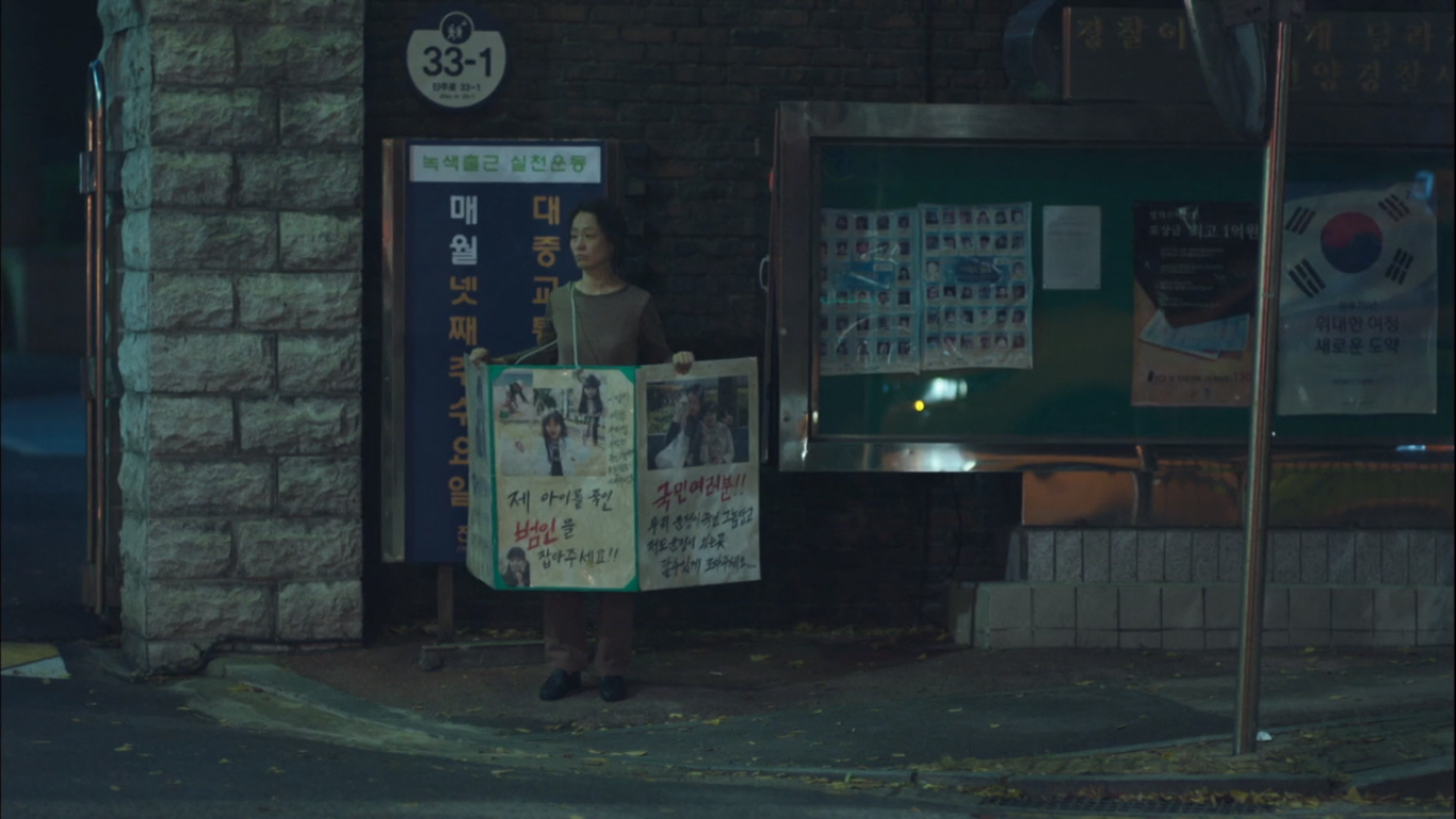 윤정이의 엄마는 범인을 잡아달라는 1인 시위를 한다. 눈이 오나 비가 오나 같은 자리에 서서 몇 년 동안 시위하는 윤정이 엄마.