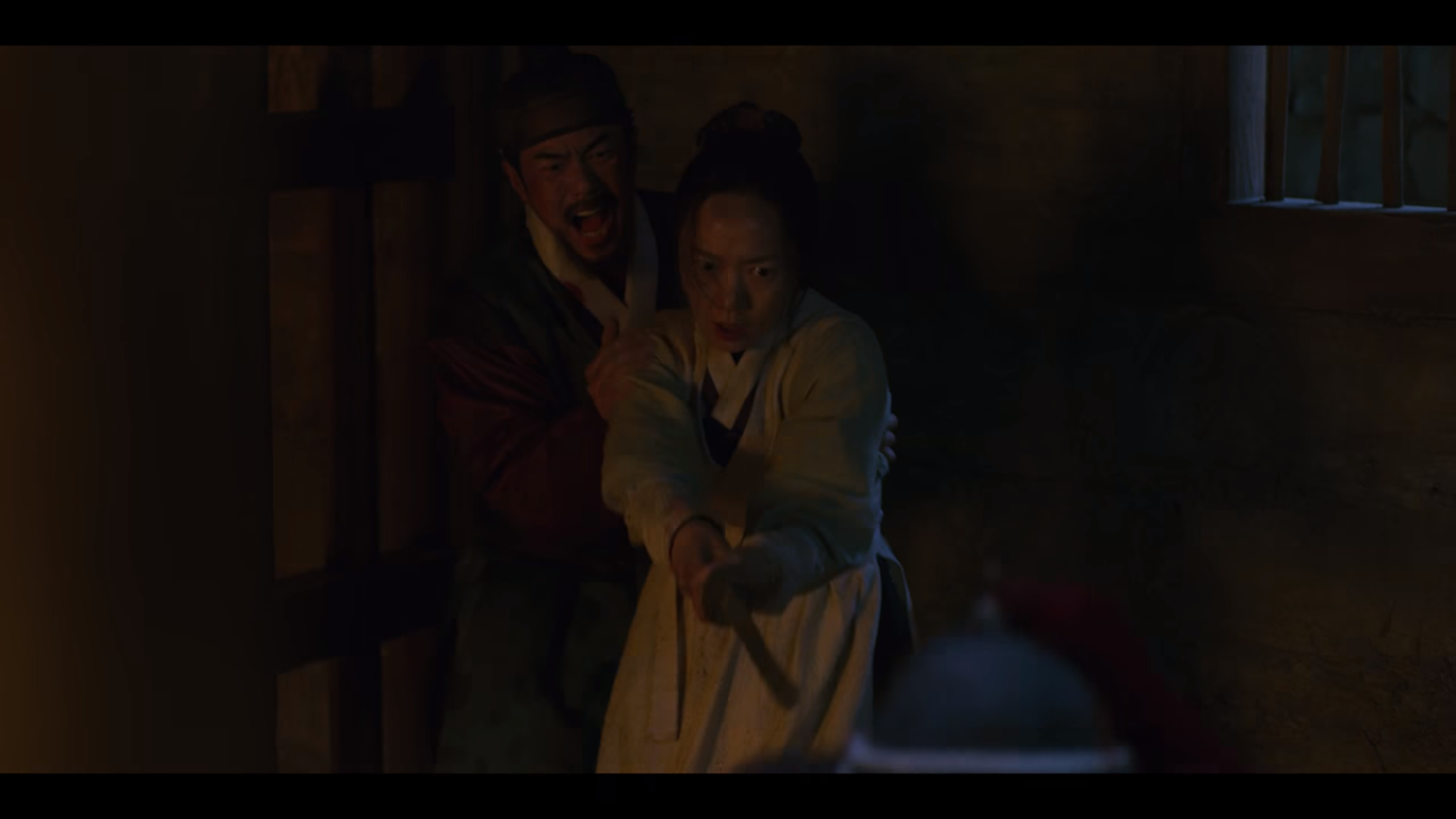 서비가 무영을 따라 지율헌으로 가면서 과거 장면이 나온다. 처음 지율헌 사람들이 괴물이 됐을 때 말이다. 킹덤 1회 엔딩과 이어지는 부분이다. 서비와 영신이 창고에서 나오는데 서비의 친구 영주가 그들을 덮치려 한다. 두 사람은 다시 창고 안으로 들어가는데 그때 이승희가 창고 안으로 들어온다.