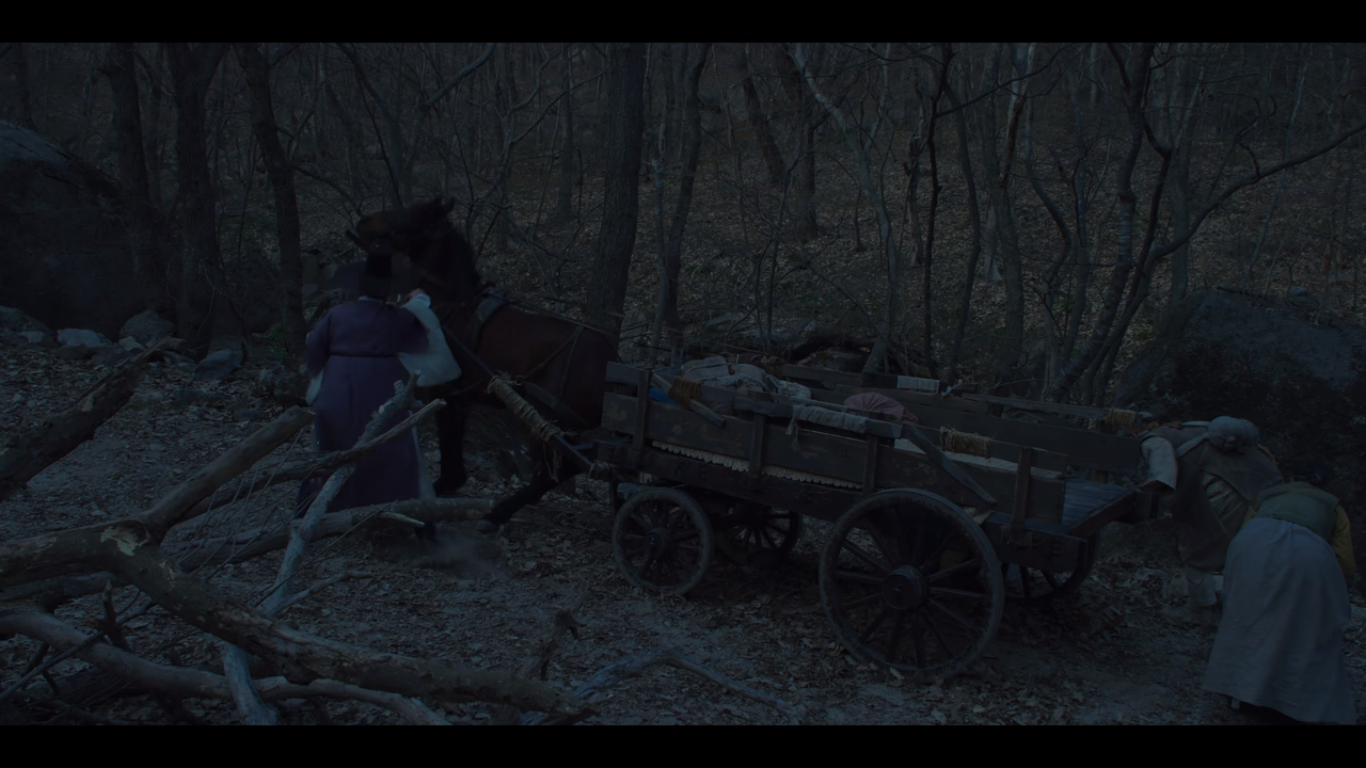 하지만 곧 산 속에 있던 병자들이 깨어나 이창 무리를 뒤쫓는다. 앞에서도 두 명의 병자들이 이창의 무리를 덮치는데 조총을 다루던 군졸이 화를 피하지 못한다. 영신은 재빨리 조총을 주워 수레에 타고, 이창의 뒤를 쫓는 병자의 머리를 정확히 사격한다.