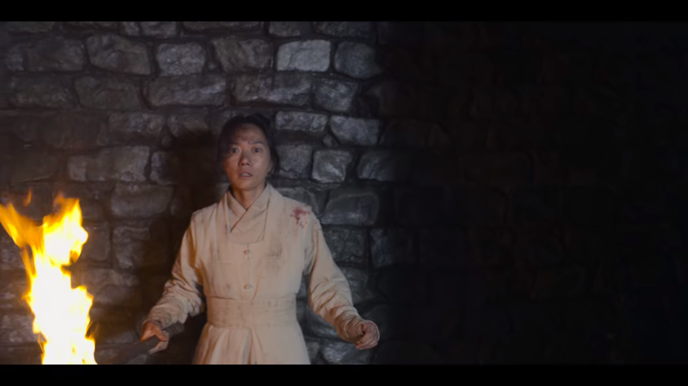 열심히 역병 환자들을 죽이는 이창 일행. 조범팔을 죽을 것 같은데 아슬아슬하게 살아남는다. 병자때문에 얼굴에 피칠갑을 한 조범팔. 원래 다른 좀비 영화 였으면 저 피 때문에 감염되었을텐데 킹덤은 바이러스가 아니라 벌레때문에 그런거라 멀쩡하다.