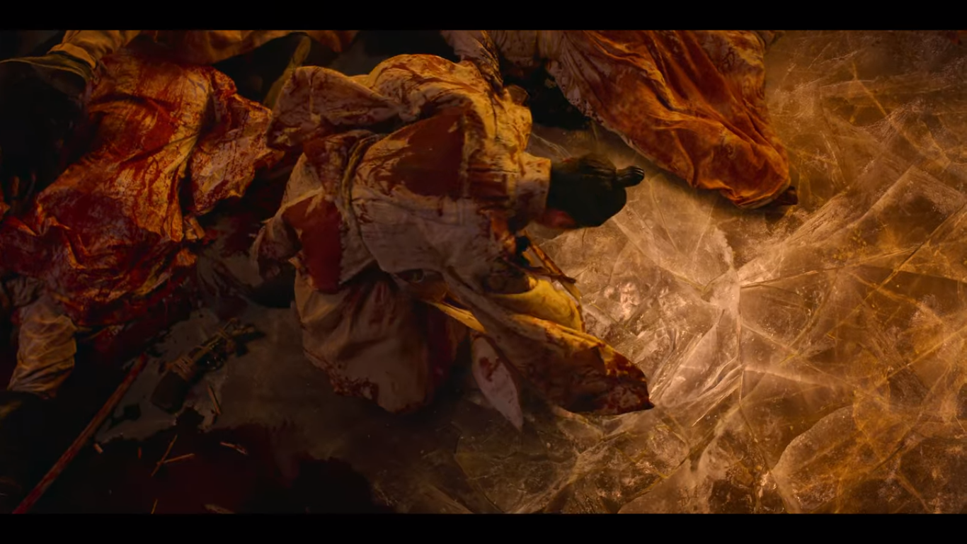 결국 병자에게 물리고 마는 이창. 이창은 못바닥에 총도 쏘고, 총으로 부수기도 하고, 총이 부러지자 자신의 주먹으로 못바닥을 내려친다. 얼어붙은 못은 금은 가는데 잘 깨지지가 않는다.