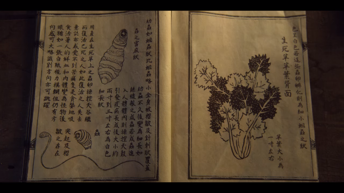 '역병은 생사초로 죽은 자를 되살리면서 생겨났습니다. 생사초에 낳은 충의 알이 천곡을 조종하여 죽은 자를 되살리는데, 이렇게 되살아난 자는 이지를 잃고 고통을 느끼지 못하며 산 사람의 피와 살만을 탐하게 됩니다. 죽음에서 되살린 자에게 물린 자는 몸 안에 벌레가 들어오지만 괴물로 변하지는 않고, 다만 몸이 차갑게 변하며 시름시름 앓다 죽음에 이릅니다. 병증이 전염되기 시작한 것은 동래 지율헌. 병자에게 물려 숨진 시신에 열을 가하고 사람들이 먹자 경련과 함께 죽음에 이르렀다 괴물로 변하였는데, 이때부터 그 괴물에게 물린 사람들도 괴물로 변하였습니다. 하나 물렸다고 해서 모두 괴물로 변하는 것은 아닙니다. 병자에게 물렸어도 죽음에 이르기 전에 물에 들어가면 천곡까지 가지 못한 벌레가 몸에서 빠져나와 역병에서 벗어나게 되며, 또한 천곡이 아직 온전히 발달하지 않은 갓난아기 역시 병자에게 물려도 병이 옮기지 않습니다. 찬 성질을 좋아하여 더운 기운이 강한 봄, 여름에는 발병하지 못하고 가을과 초겨울에는 해가 있는 동안만 발병하지 못하고, 1년 중 가장 찬 동지부터 입춘까지는 낮밤 모두 깨어납니다. 그러나 아직까지 밝혀지지 않은 것이 있습니다. 분명 이 벌레는 찬 성질을 좋아했는데 반대로 열을 가하자 더욱 폭주하며 전염이 시작됐습니다. 생사초에는 더 큰 비밀이 숨겨져 있습니다.'