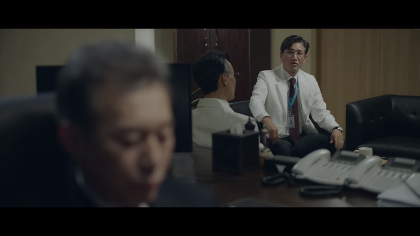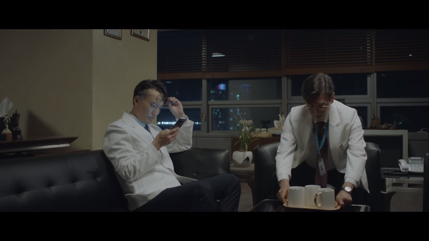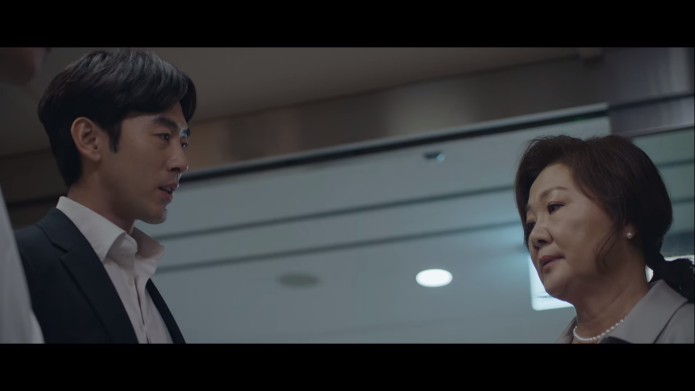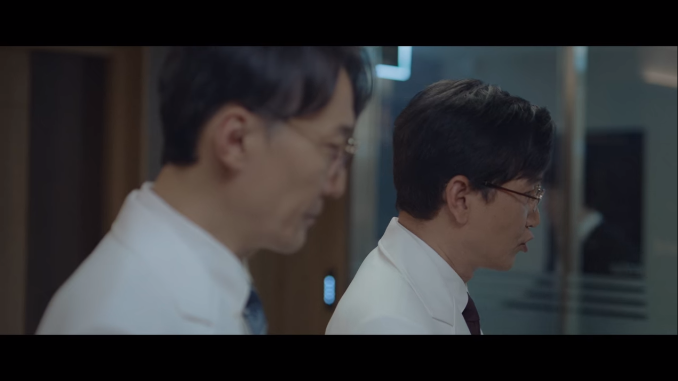 왼쪽이 율제그룹 안병우 회장의 아내 정로사, 오른쪽은 율제그룹의 전무 주종수다. 주종수는 정로사에게 율제병원의 병원장 주전과 뇌센터 센터장을 소개한다. 현재 안병우의 상태는 어려운 상황. 소식을 들은 편 변호사가 정로사에게 잠깐 보자고 한다.