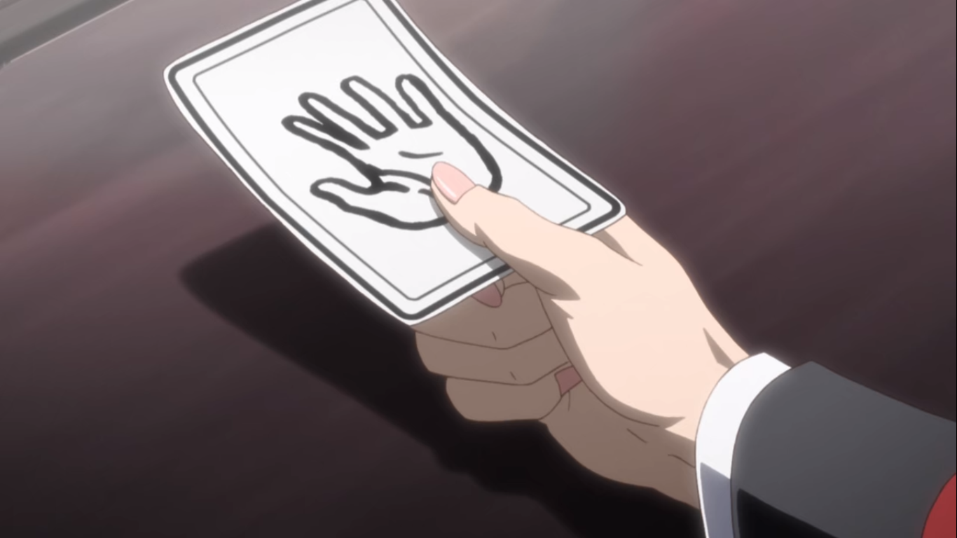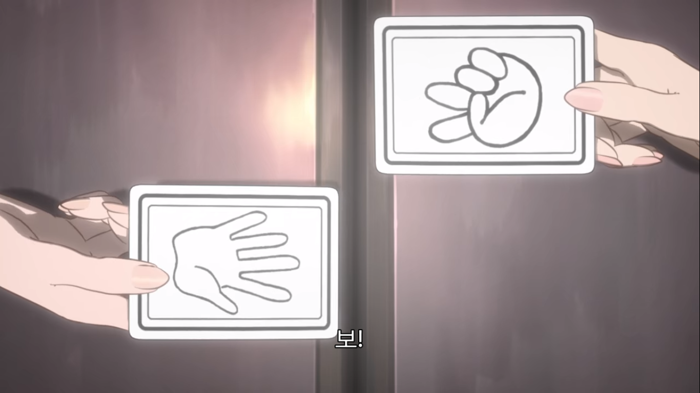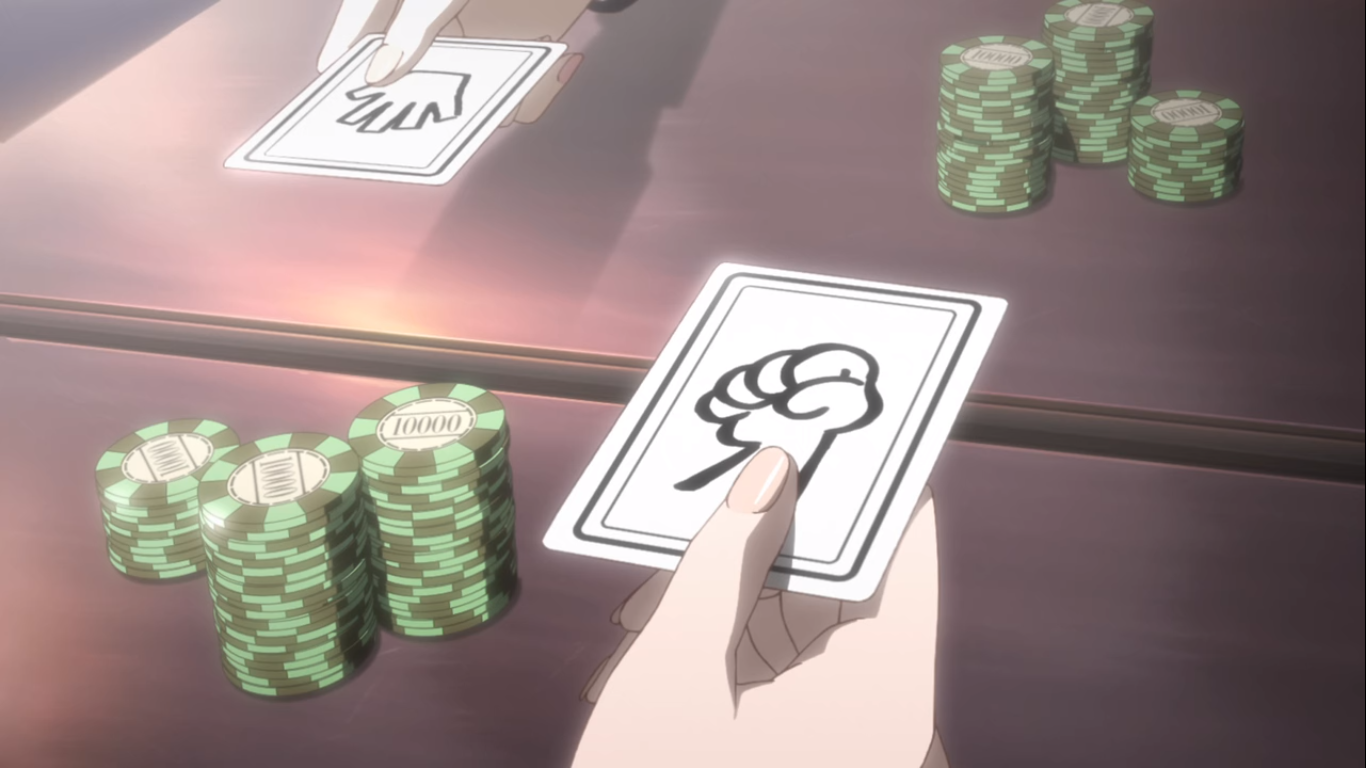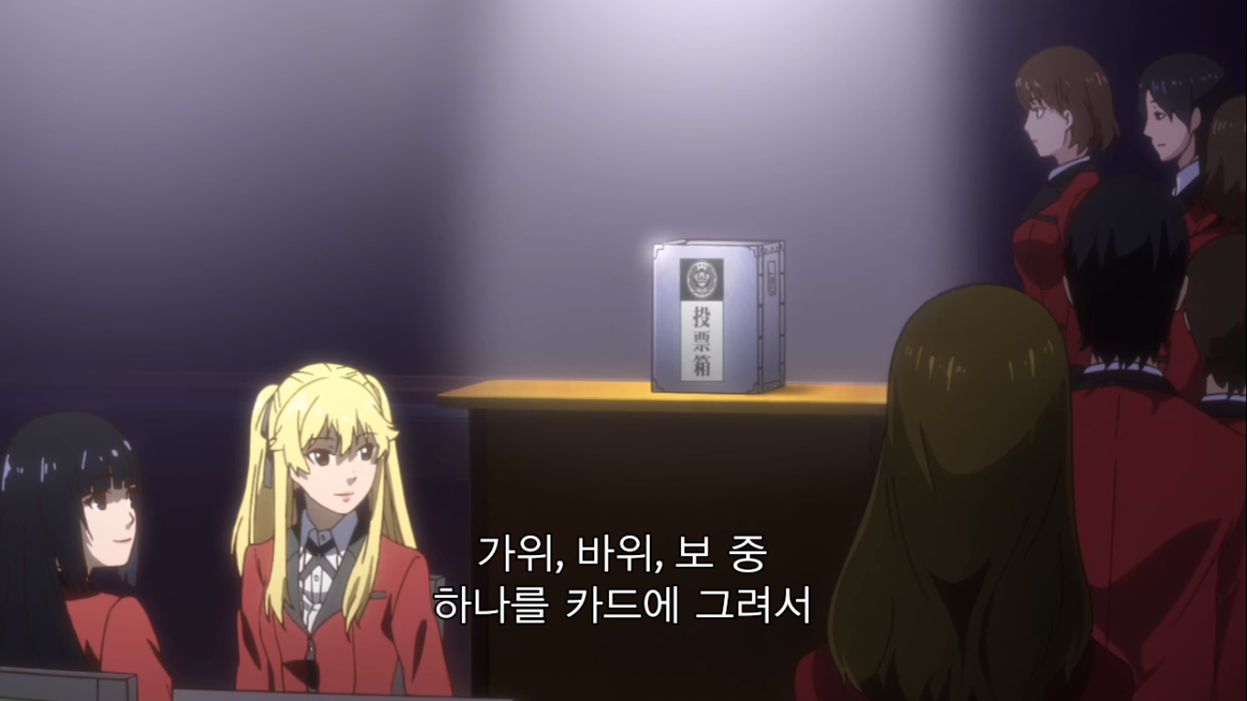 이들이 할 도박은 하나반에서 만든 '투표 가위바위보'라는 도박이다. 하는 방법은 반 아이들 모두가 가위, 바위, 보 중 하나를 카드에 그려서 플레이어가 보지 못하게 통에 집어넣는다. 그 후 플레이어가 상자에서 카드 세장을 뽑아 그 중 하나로 가위바위보를 한다. 똑같은 게 나오면 남은 카드 중에서 하나를 골라 다시 가위바위보를 한다. 세 번 다 비기면 무승부. 여기까지가 한 세트다.