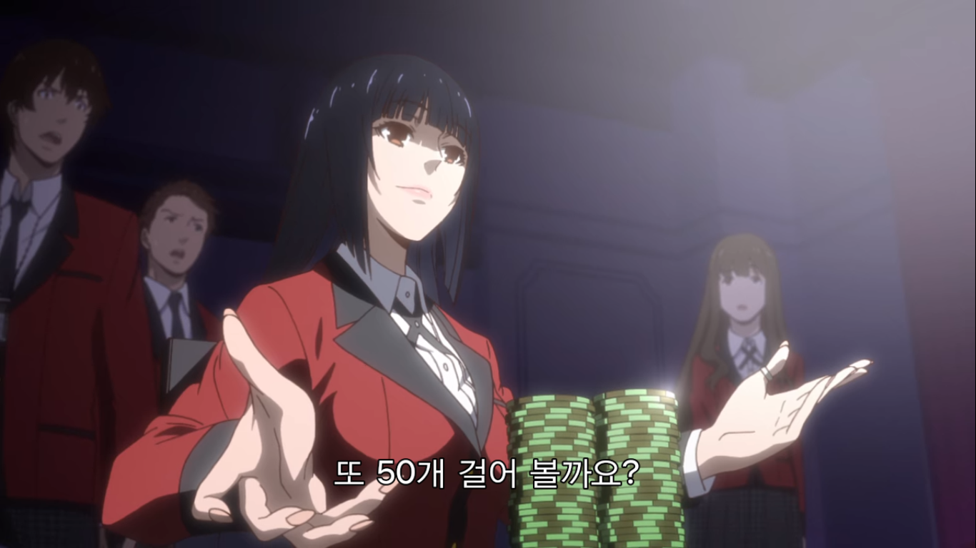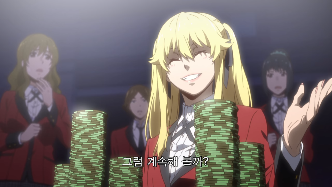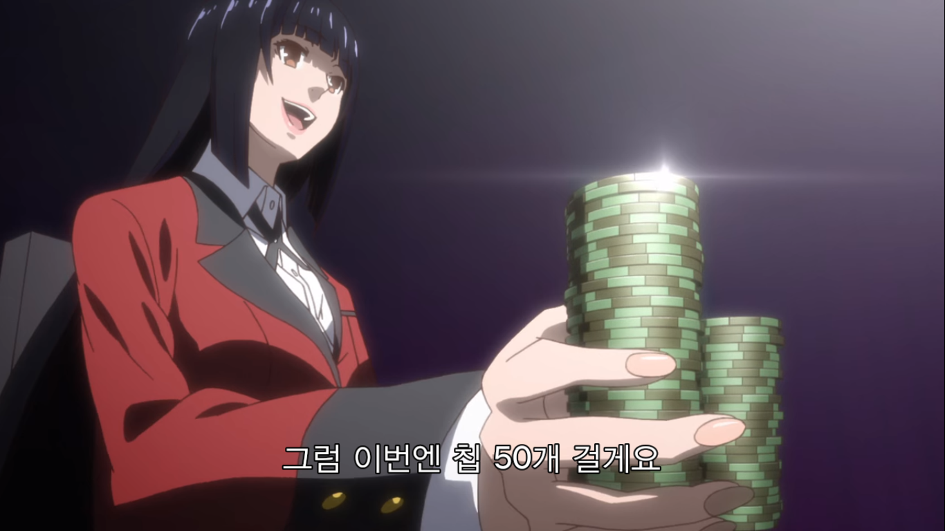 "그게 묘미 아니겠어요? 도박은 원래 제정신으로 하는 게 아니잖아요. 자본주의 사회에서 돈은 곧 목숨! 목숨을 운에 맡기다니 제정신이 아니죠. 그래도 카지노엔 사람들이 바글바글해요. 목숨을 거는 광기에 쾌감을 느끼니까요! 그러니까 미칠수록 도박이 재밌는 거예요! 자, 도박에 미쳐보자고요!"