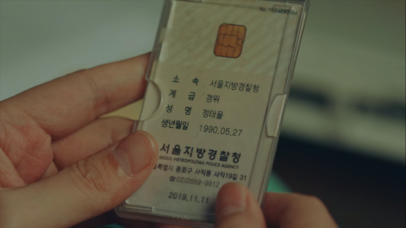 25년 전 생명의 은인 품에서 꺼낸 신분증을 보는 이곤. 그 신분증은 서울지방경찰청 정태을의 공무원증이었다. 그런데 발급일자가 2019년 11월 11일이다. 이곤이 이 신분증을 가진 건 1994년인데 시간의 왜곡이 있는 것 같다. 누가 미래에서 과거로 온 듯. 평행세계도 있는데 시간여행쯤이야ㅋㅋㅋ 공무원증을 보고 정태을이 이곤의 생명의 은인인가 싶었는데 위에 실루엣을 잘 보면 뭔가 남자인 것 같다. 생명의 은인은 정태을이 아니라 다른 사람인 듯. 이곤이 이 신분증을 보고 있는 현재 대한제국의 시간은 2019년 9월 10일.