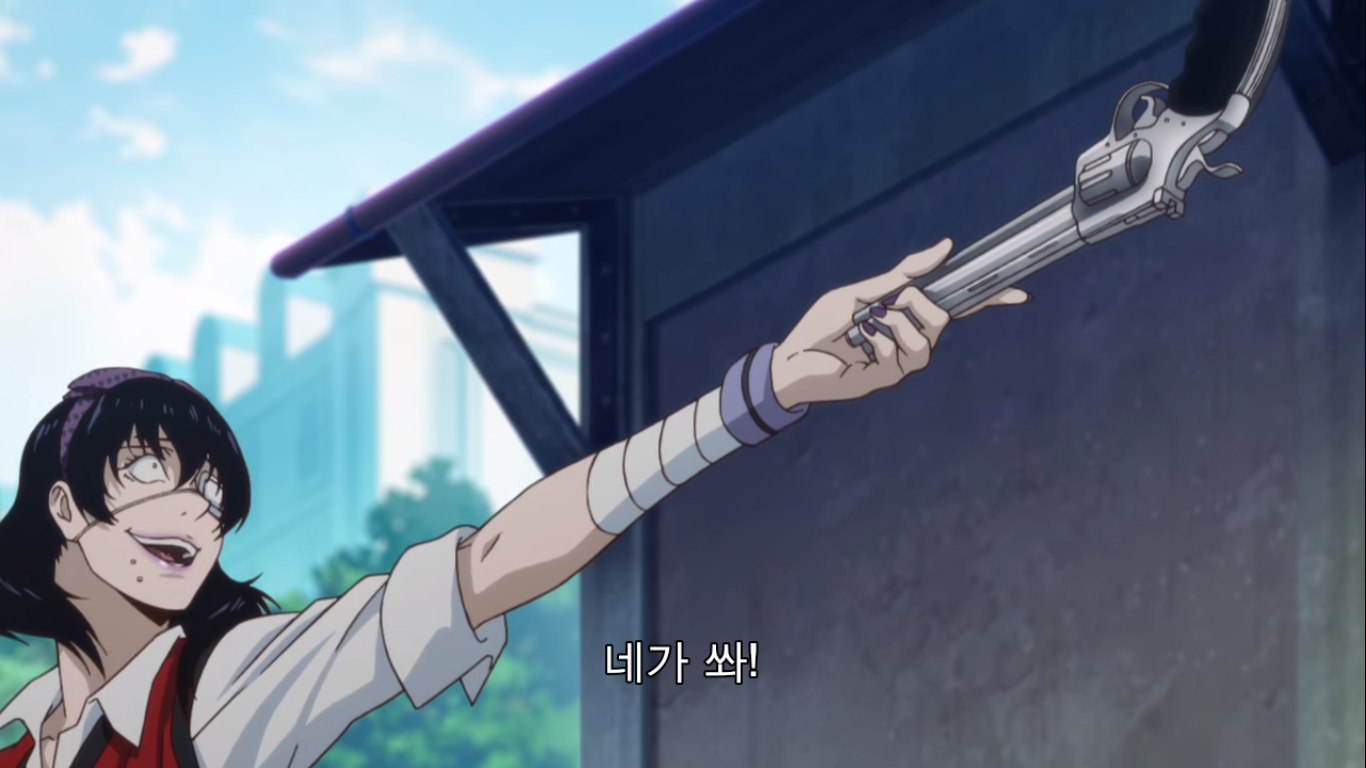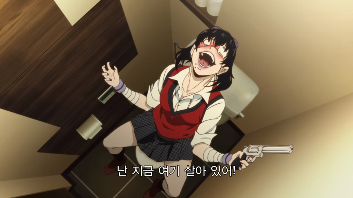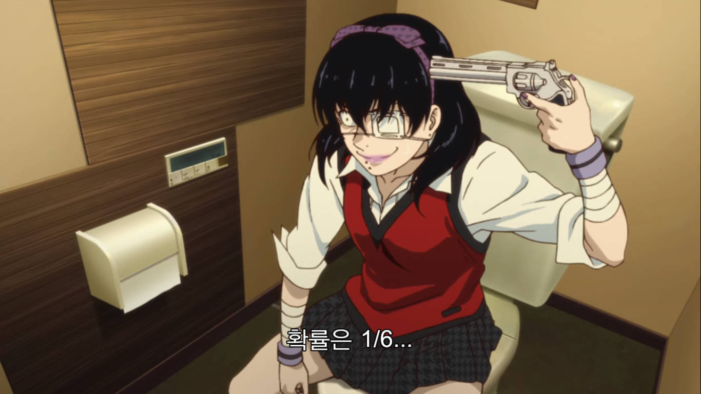 유메코는 미다리에게 감사 인사를 전한다. 미다리는 혼자 화장실에 들어가 러시안룰렛을 한다. 위에서 보면 알겠지만 얘도 또라이다. 유메코가 도박에 미쳤다면 미다리는 죽을 수 있는 상황에 대한 스릴과 위험에 미친 애.