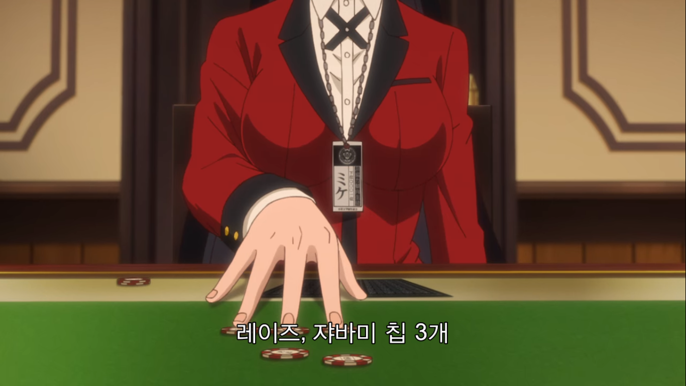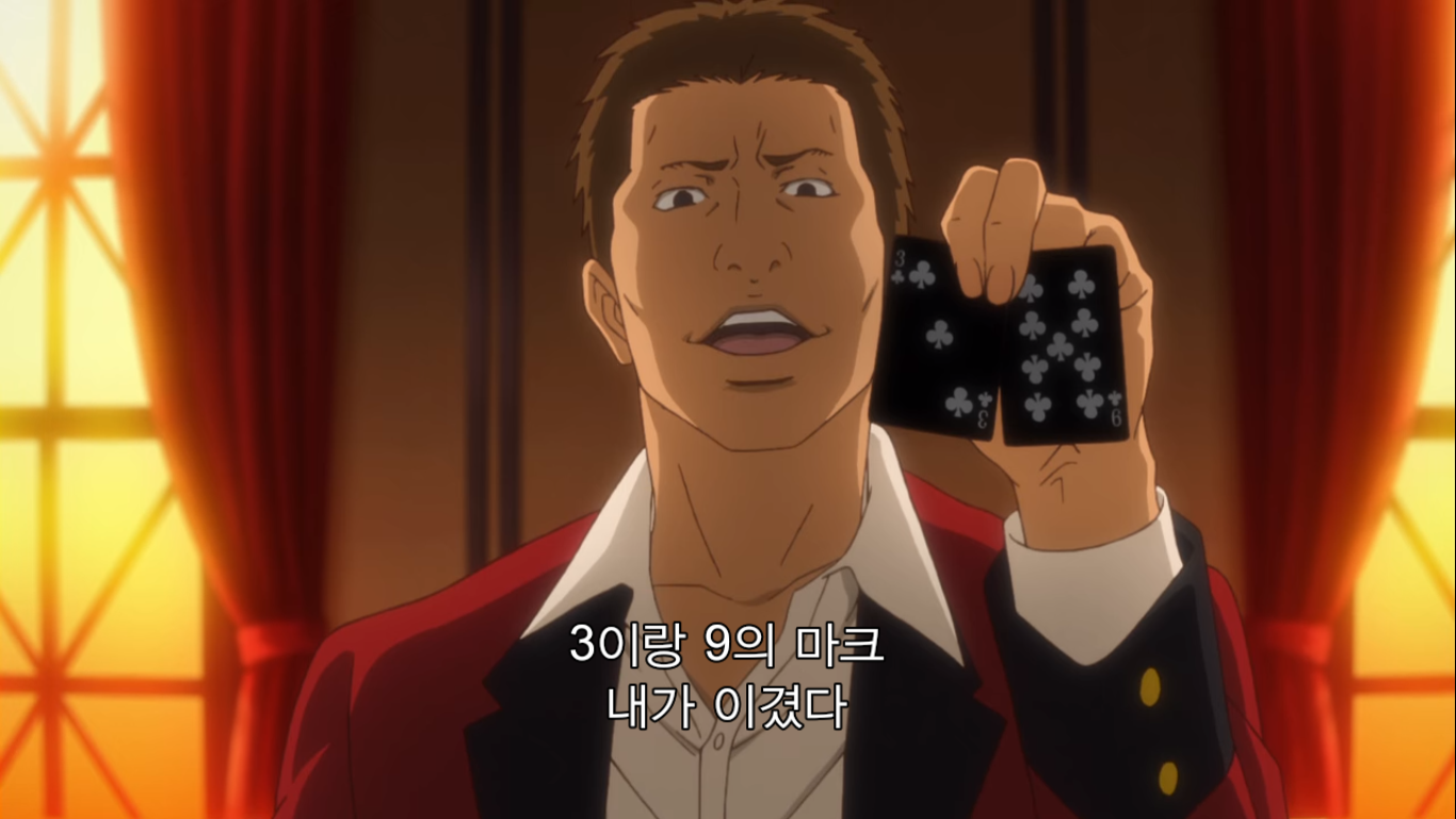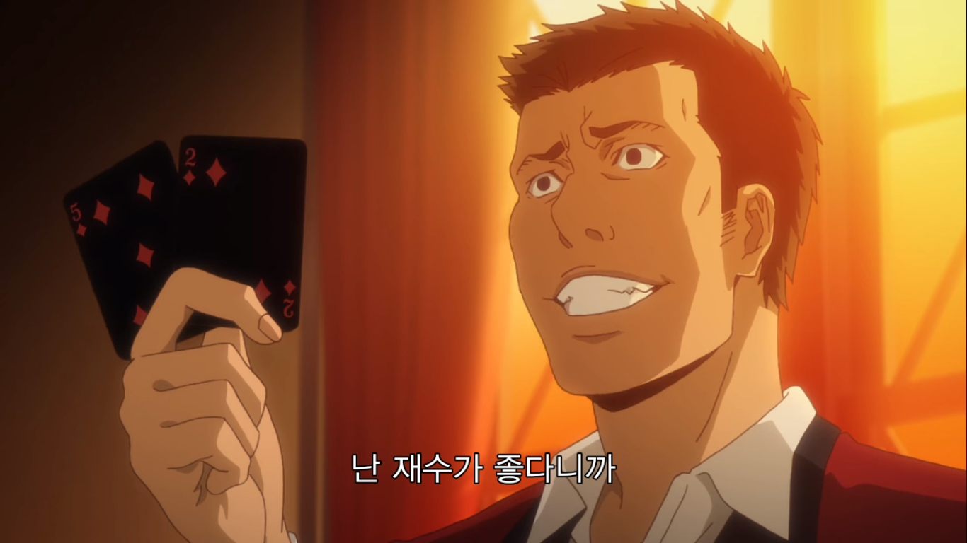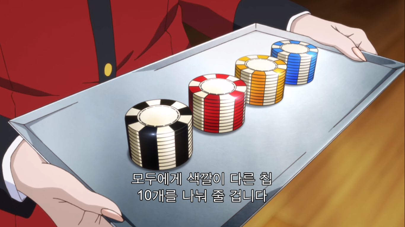 "그럼 어떤 도박인지 설명하죠. 이번에 준비한 도박은 '2장 인디언 포커'예요. 규칙은 간단해서 조커와 그림 카드를 뺀 40장의 카드를 쓰게 됩니다. 먼저 딜러가 첫 번째 카드를 나눠 줄 테니까 확인하세요. 그리고 두번째 카드가 나갑니다. 그건 보지 말고 이마 위에 대세요. 공개 카드와 비공개 카드, 이 두장으로 승부를 볼겁니다. 두 장의 숫자가 같은 '페어'가 제일 점수가 높고, 다음은 모양이 같은 '마크', 숫자랑 모양이 다 다른 '부타'가 제일 낮죠. 같은 패가 나오면 숫자가 높은 사람이 이깁니다. 이 게임의 묘미는 여기서부터죠. 모두에게 색깔이 다른 칩 10개를 나눠 줄 겁니다. 이 게임에서 칩 개수는 중요하지 않아요. 마지막에 칩의 총액으로 승자가 결정되니까요. 칩 금액은 각자가 신고한 채무액의 1/10입니다. 빚이 1억엔이면 1장이 천만 엔이 되죠. 총 10판을 치르고, 판마다 참가비로 칩 1개가 필요해요. 한번에 칩 5개까지 걸 수 있고요. 마지막으로 저희는 절대 나서지 않겠습니다. 사기를 친다고 해도요. 도박의 세계에서는 속는 사람이 문제죠. 지적을 당하면 막겠지만 그때까지의 성적은 그대로 유지됩니다. 이상으로 설명을 마칩니다. 그럼 행운을 빌죠."