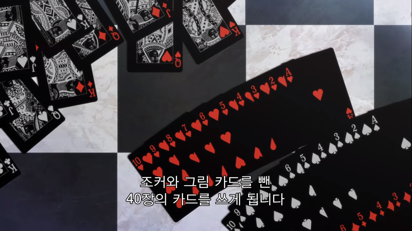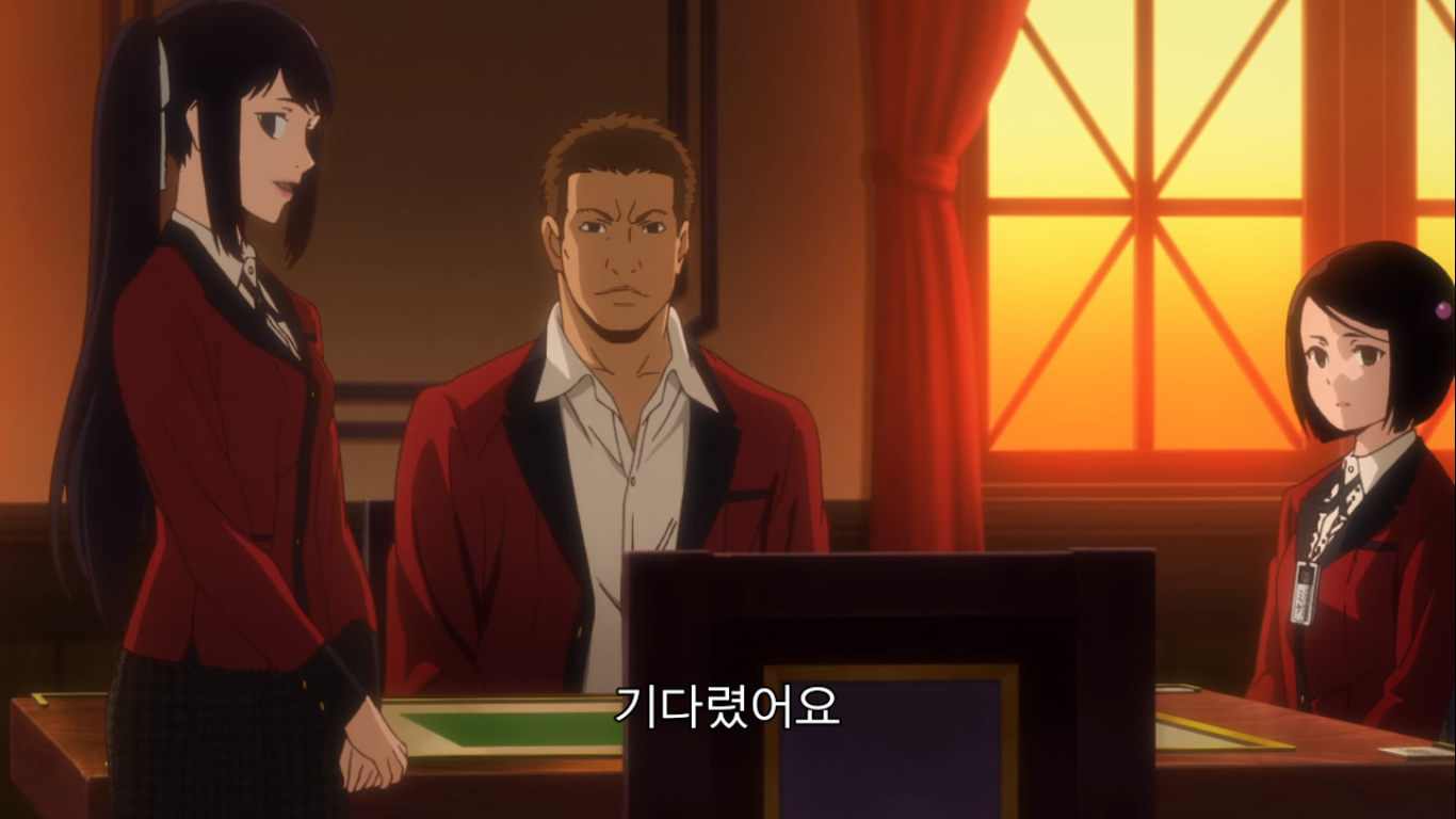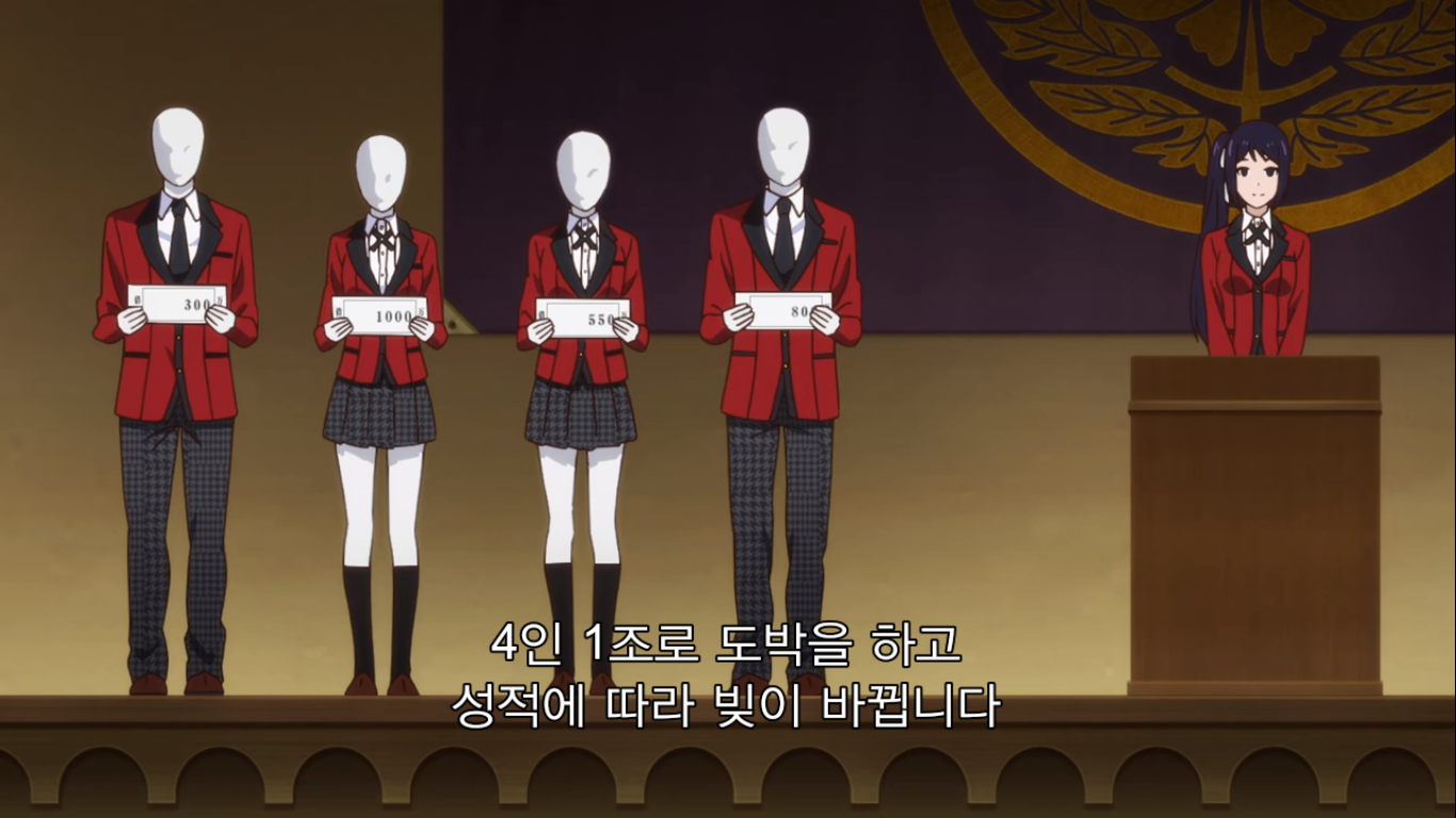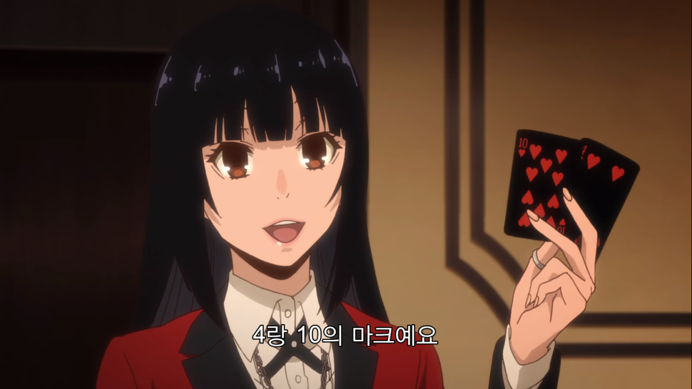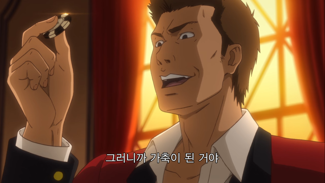 "그럼 어떤 도박인지 설명하죠. 이번에 준비한 도박은 '2장 인디언 포커'예요. 규칙은 간단해서 조커와 그림 카드를 뺀 40장의 카드를 쓰게 됩니다. 먼저 딜러가 첫 번째 카드를 나눠 줄 테니까 확인하세요. 그리고 두번째 카드가 나갑니다. 그건 보지 말고 이마 위에 대세요. 공개 카드와 비공개 카드, 이 두장으로 승부를 볼겁니다. 두 장의 숫자가 같은 '페어'가 제일 점수가 높고, 다음은 모양이 같은 '마크', 숫자랑 모양이 다 다른 '부타'가 제일 낮죠. 같은 패가 나오면 숫자가 높은 사람이 이깁니다. 이 게임의 묘미는 여기서부터죠. 모두에게 색깔이 다른 칩 10개를 나눠 줄 겁니다. 이 게임에서 칩 개수는 중요하지 않아요. 마지막에 칩의 총액으로 승자가 결정되니까요. 칩 금액은 각자가 신고한 채무액의 1/10입니다. 빚이 1억엔이면 1장이 천만 엔이 되죠. 총 10판을 치르고, 판마다 참가비로 칩 1개가 필요해요. 한번에 칩 5개까지 걸 수 있고요. 마지막으로 저희는 절대 나서지 않겠습니다. 사기를 친다고 해도요. 도박의 세계에서는 속는 사람이 문제죠. 지적을 당하면 막겠지만 그때까지의 성적은 그대로 유지됩니다. 이상으로 설명을 마칩니다. 그럼 행운을 빌죠."