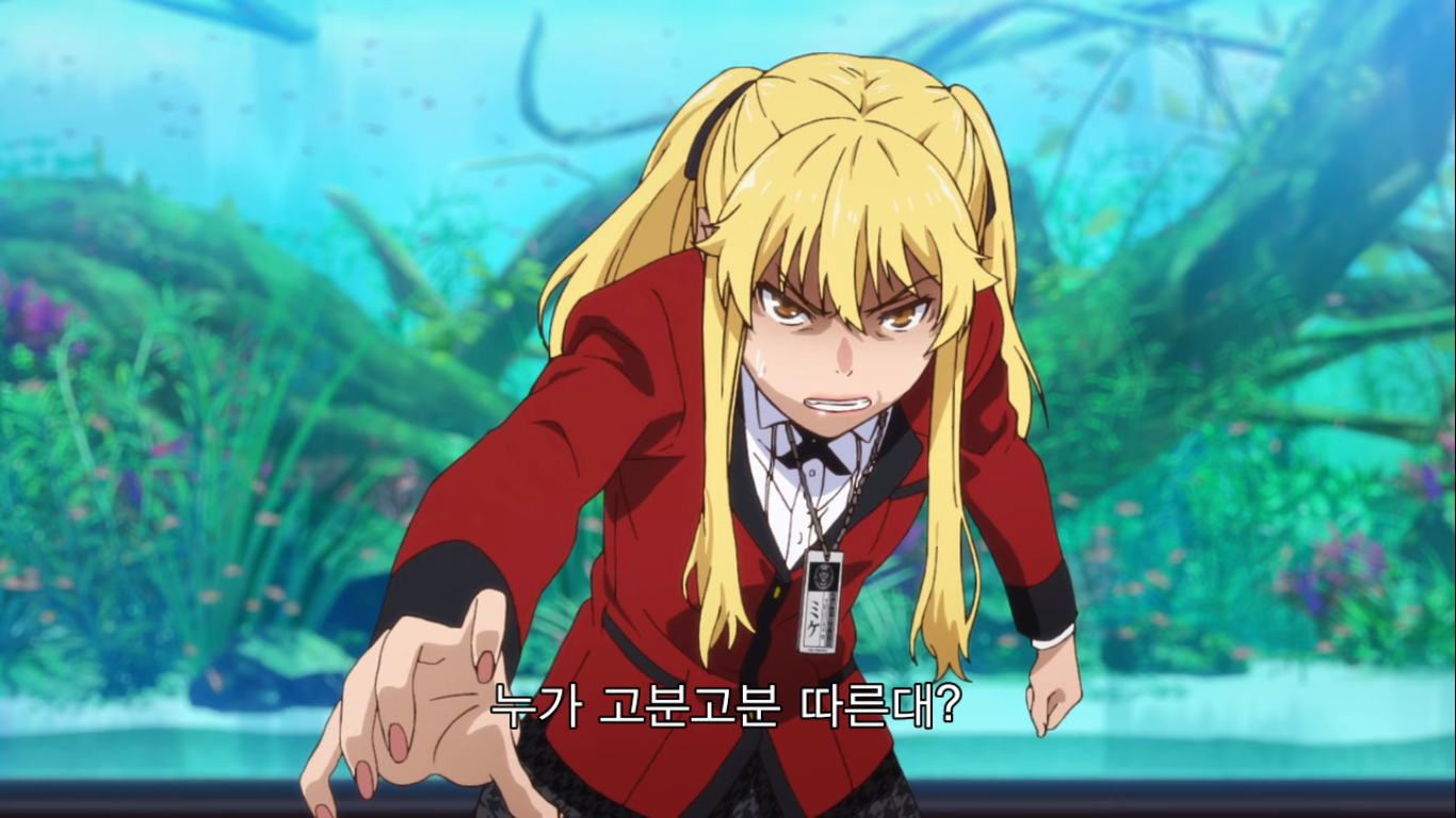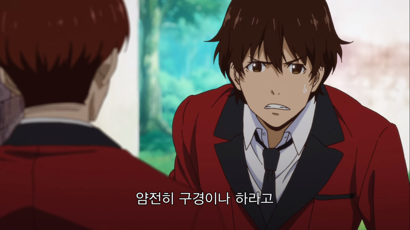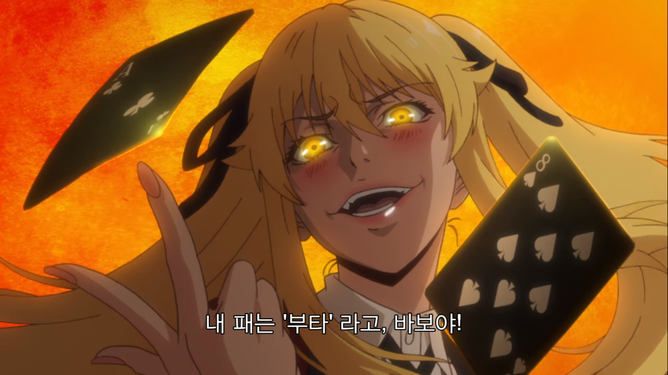 "바보 아니야? 유메코가 이겼다고 내가 쫄아서 발 뺄 줄 알았냐? 내가 이기면 넌 달랑 칩 2개 남아. 역전은 꿈도 못 꾼다고. 콜... 할 리가 없지. 가축이 하는 짓은 빤히 보여. 사오토메랑 유메코 둘이 짰지? ... 미안하지만 가축은 인간님을 속일 수 없다고! 폴드."