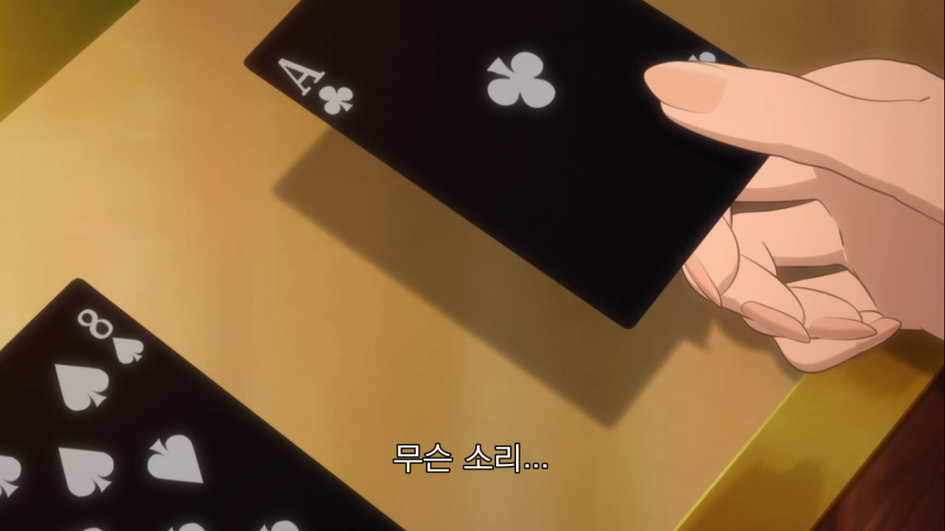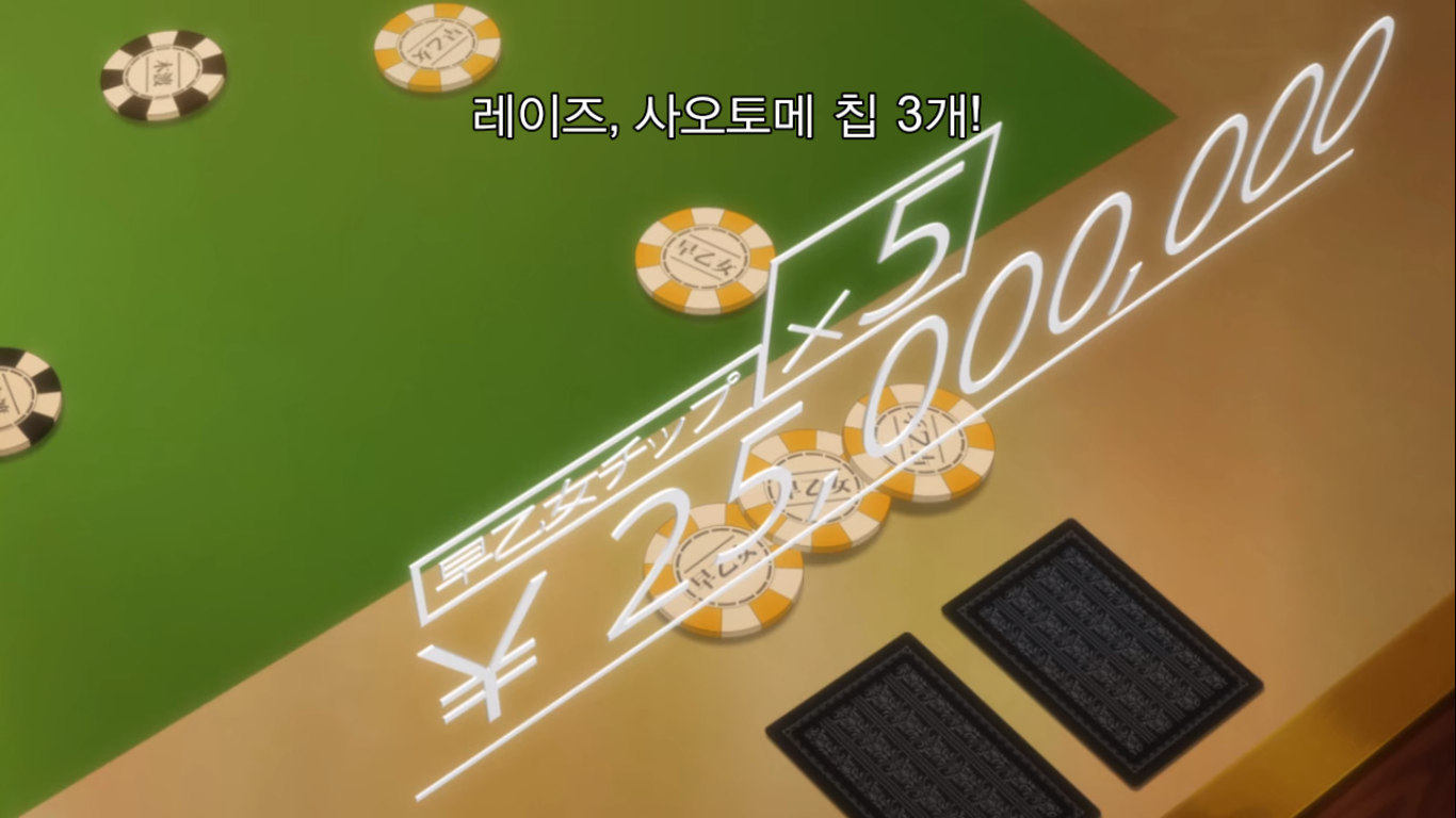 4라운드. 메아리가 1개를 배팅하자, 쥰과 유메코는 쥰 칩 1개씩으로 콜을 한다. 3개를 더 배팅하는 메아리.