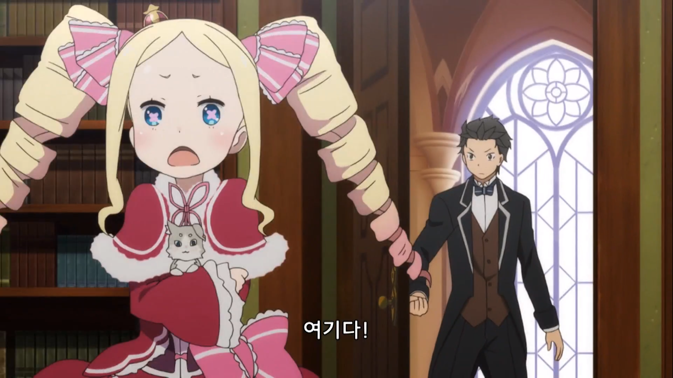 처음 보는 방에서 눈을 뜬 스바루. 방을 빠져나와 복도를 걷는데 같은 곳을 맴돌고 있다. "정답인 방을 찾아야 나갈 수 있는 전개인가? 흔한 패턴으론 원래 있던 방이 골인점일 가능성!"이라며 방문을 열자 어떤 여자애가 앉아서 책을 읽고 있다. 이 방은 베티의 서고 겸 침실 겸 개인 방이라고 한다. 이 여자애 이름이 베아트리체 혹은 베아트리스인데 걍 베티라고 해야겠다.