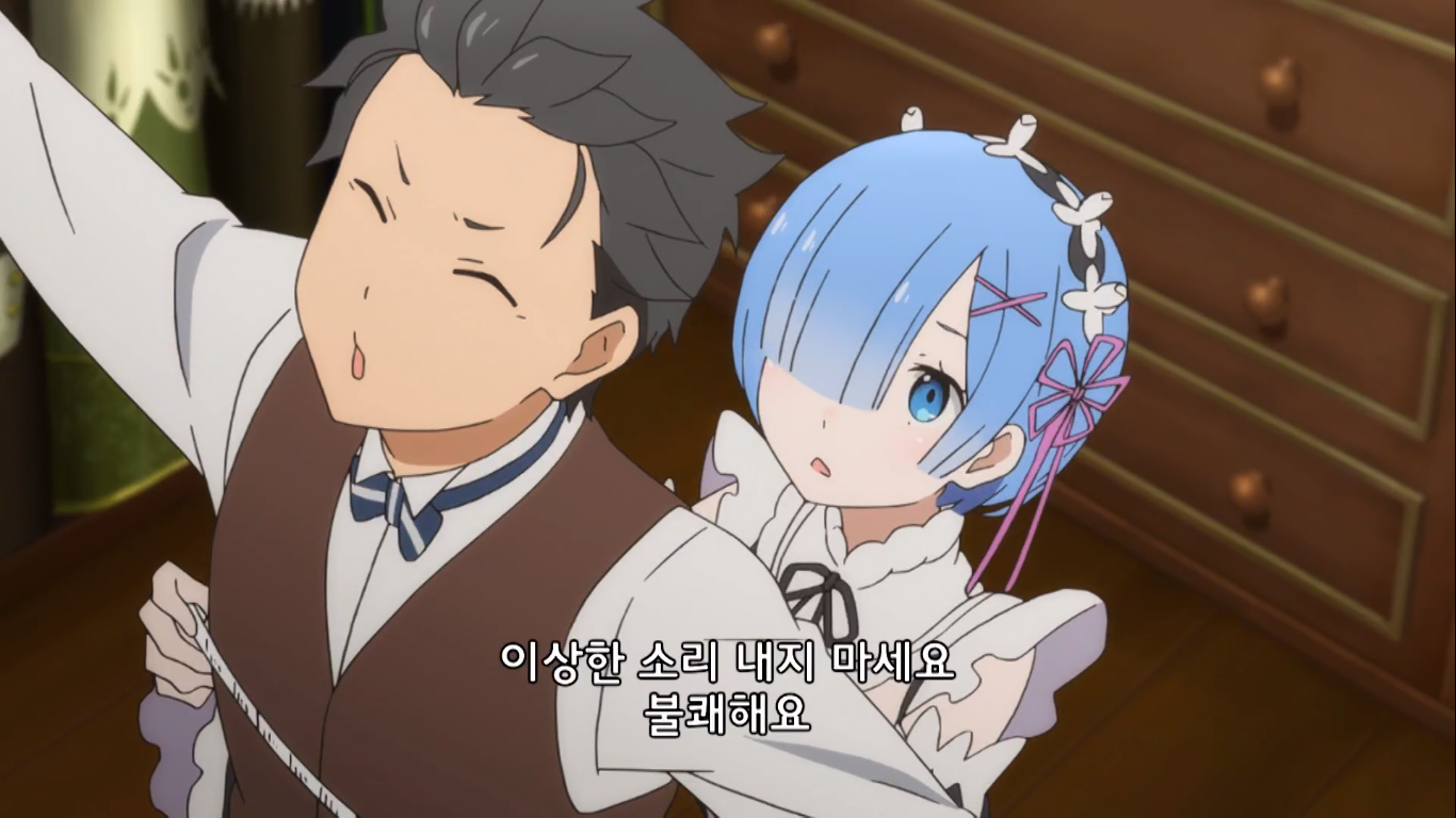 베티때문에 기절했다 깬 스바루 앞에는 쌍둥이 메이드 렘과 람이 있었다. 메이드복 보고 좋아하는 스바루.