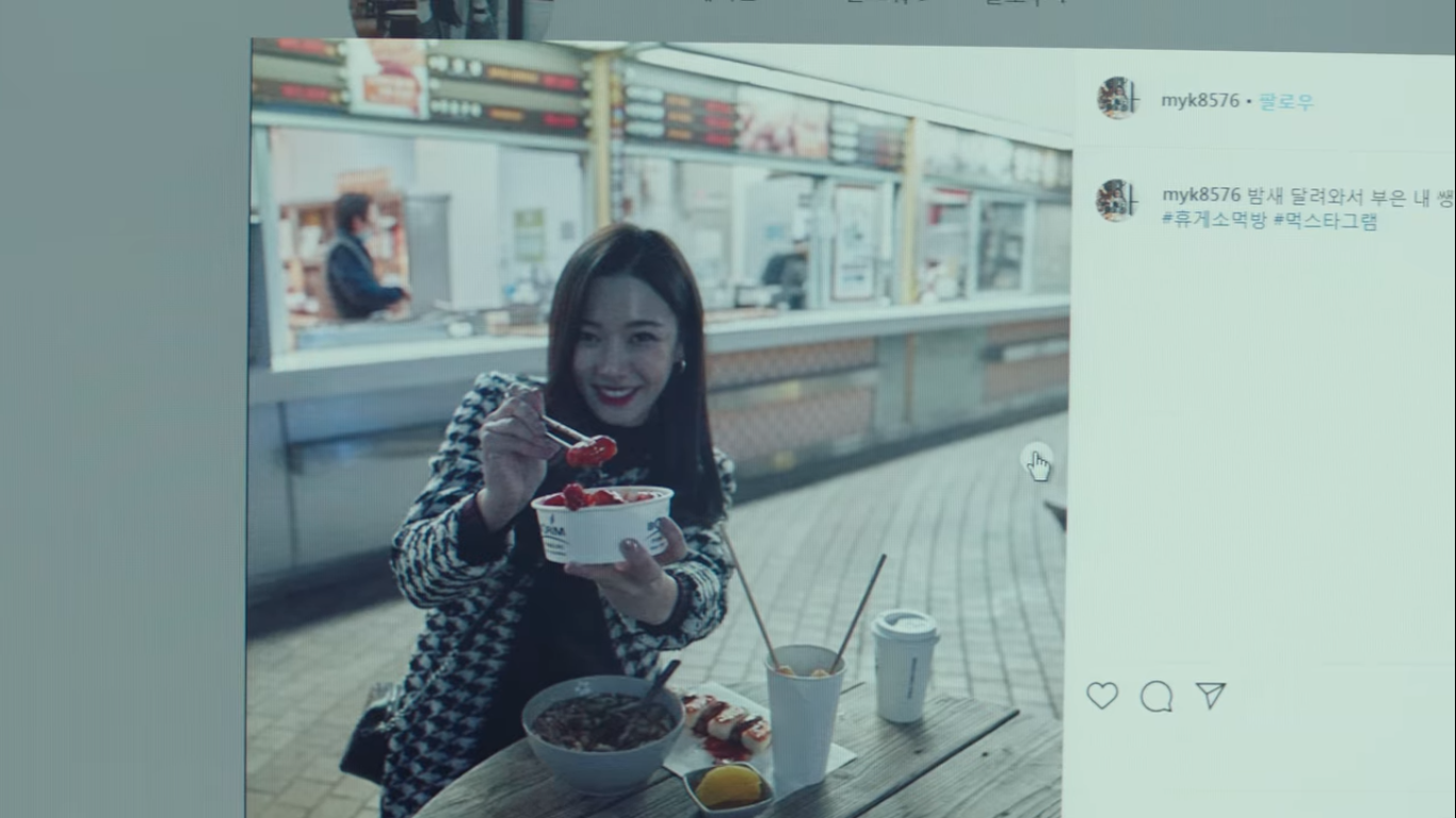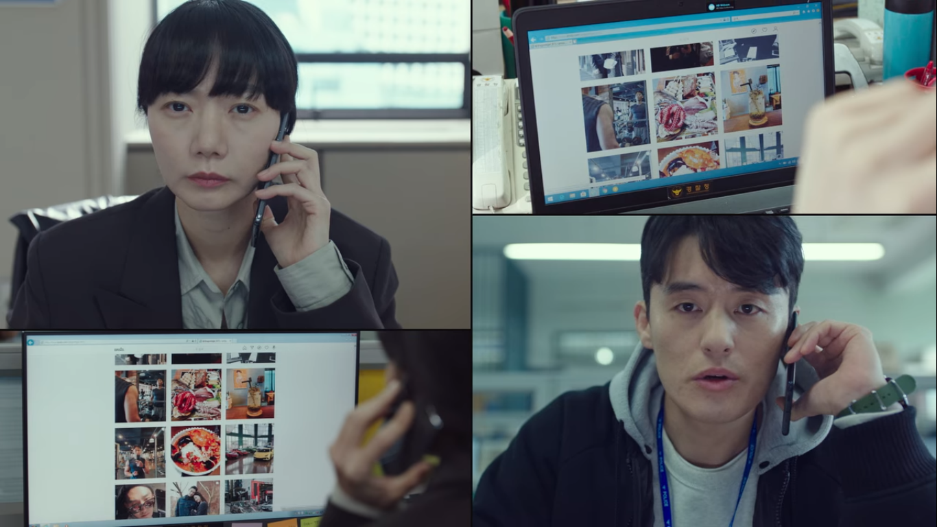 장건과 함께 그 남자의 인스타를 뒤져서 정보를 얻는 한여진. 인스타 본사에 공조 요청을 해도 한참 뒤에 계정 주인을 알려주기 때문에 어쩔 수 없이 사진으로 정보를 얻는 것이다. 인스타로 얻은 정보는 myk8576이 여친인데 이 커플이 밤새 달려서 서울로 올라 온 것, 남자가 회원권이 1억이 넘는 윈터스 호텔 피트니스에 다닌다는 것, 차 번호 뒷자리가 0437이라는 것이다.