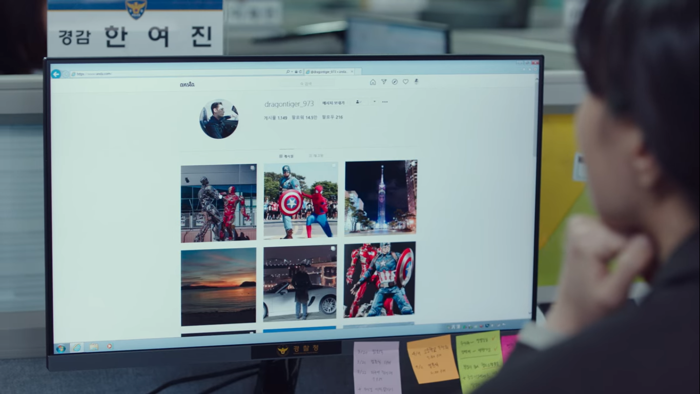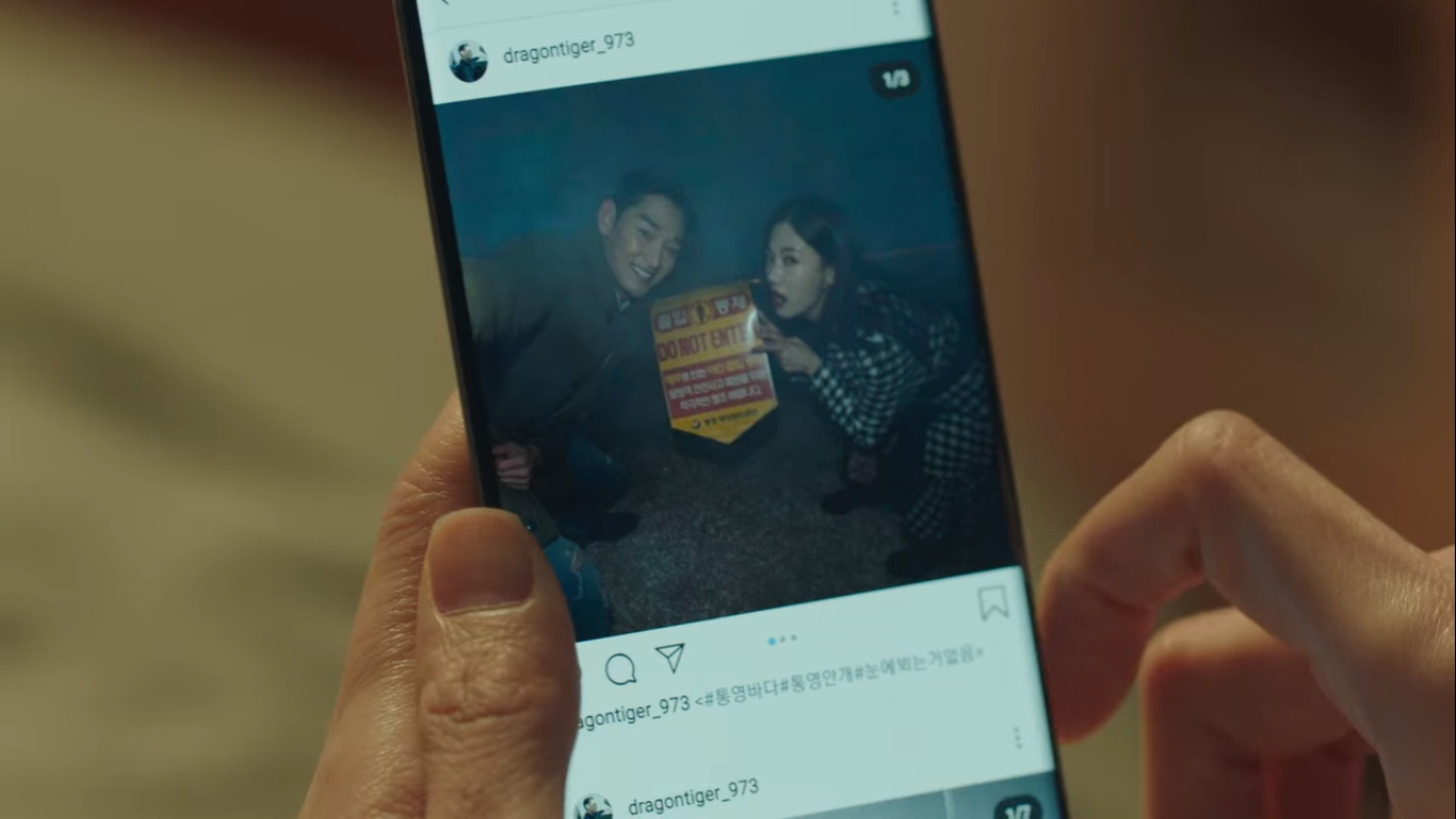 마블덕후가 된 한여진은 자신이 팔로우하던 남자의 인스타를 보고있다. 그 사람도 마블덕후라 인스타에 마블 관련 사진이 많기 때문이다. 그런데 터치를 잘못해서 마블사진이 아닌 커플 사진을 보게 된다. 통영바다 출입통제선과 안개를 배경으로 한 사진이었는데 새로고침하는 사이 사진이 삭제된다. 이 남자의 아이디가 dragontiger_973이라서 이름이 용범인가 했는데 아니었다. 남자 이름은 밑에 보다보면 나온다.