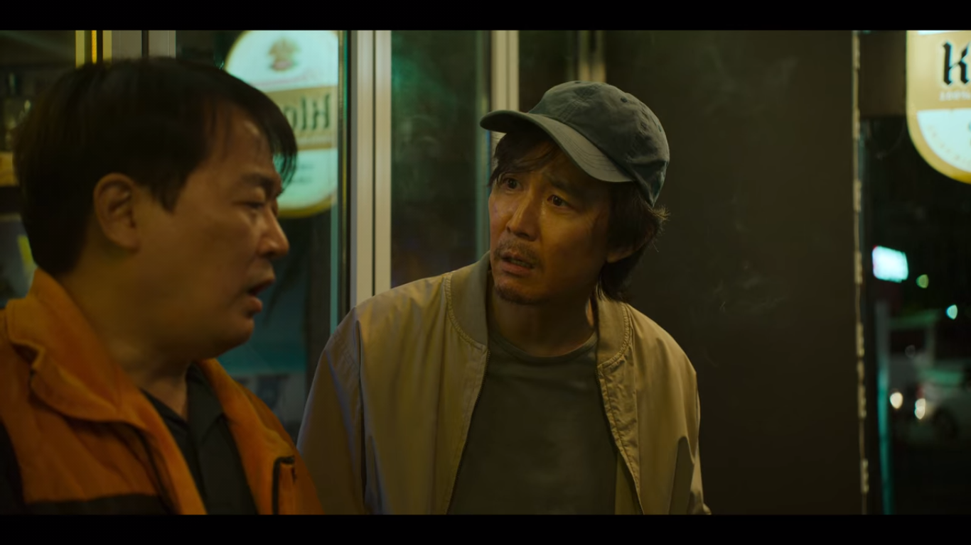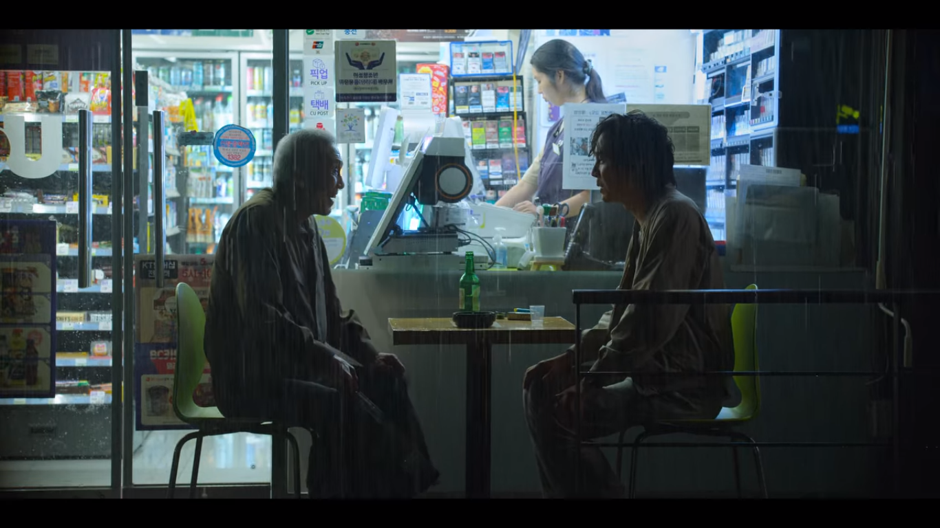 기훈은 친구에게 엄마 병원비를 빌리려하지만 실패한다. 그 후 혼자 편의점 테이블에 앉아 깡소주를 마시는데 오일남을 마주친다. 일남의 라면을 안주로 소주를 한잔씩 하는 두 사람. 일남은 다시 오징어게임에 참가하기로 했다고 얘기한다.