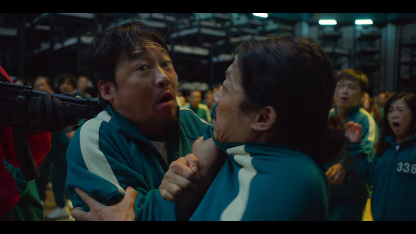 관리자들이 들어와 첫 번째 게임의 결과를 알려준다. 456명 중 255명이 탈락해 201명이 게임을 끝마쳤다. 한미녀를 시작으로 다수의 참가자들이 상금이 필요없으니 내보내달라고 애원한다. 네모 관리자가 동의서 1항을 말하며 게임을 임의로 중단할 수 없다고 하지만, 사람들은 아랑곳 않고 아우성이다. 그러다 총성 한 발에 다들 입을 꾹 다물고 숨을 죽인다.