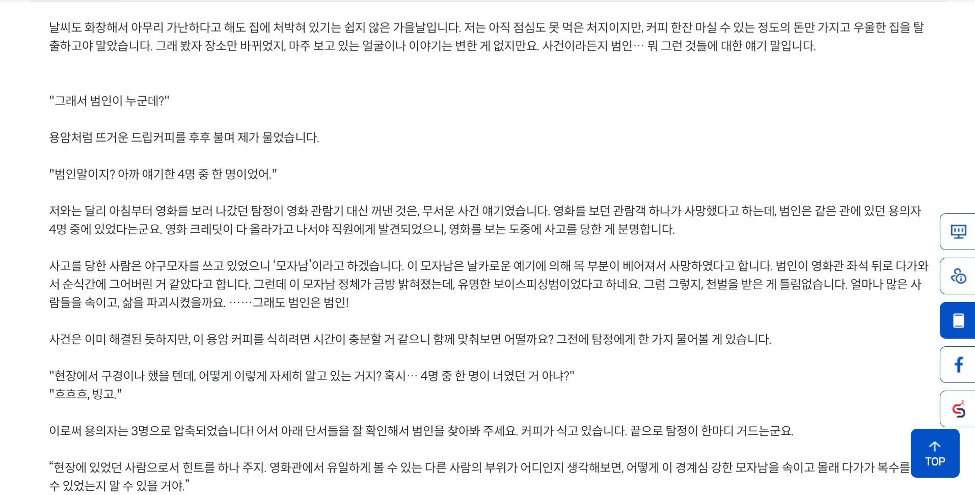 여기까지가 주어진 정보다. 그럼 바로 내가 생각한 범인과 그 이유를 말해보겠다. 먼저 용의자 네 명 중 한 명은 탐정인데, 그건 바로 D다. 탐정은 현재 나와 카페에서 용암커피를 마시고 있다. 용의자 D의 휴대폰을 보면 용암 카페에서 보자고 한 문자가 있으므로 탐정이 D라는 것을 알 수 있다. 그렇다면 D 제외.