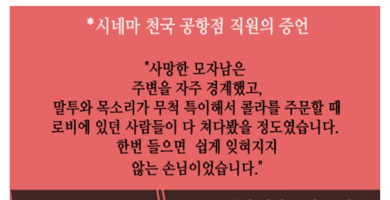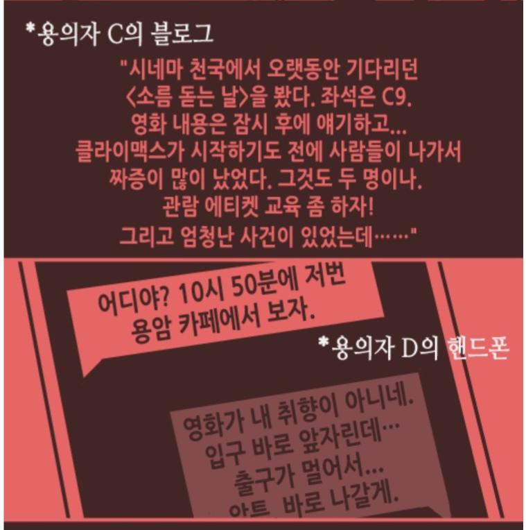 추가로 현장 사진에서 남아 있는 사람이 누구인지 보자면 왼쪽 위 여자는 뷰티 아카데미에 다니고 있는 용의자B. 오른쪽은 영화광 용의자 C다. 오른쪽 후드남이 용의자 C인 이유는 그가 모자남 기준 오른쪽에 서있기 때문이다. 좌석이 오른쪽이었기 때문에 오른쪽에서 온 상태이다.