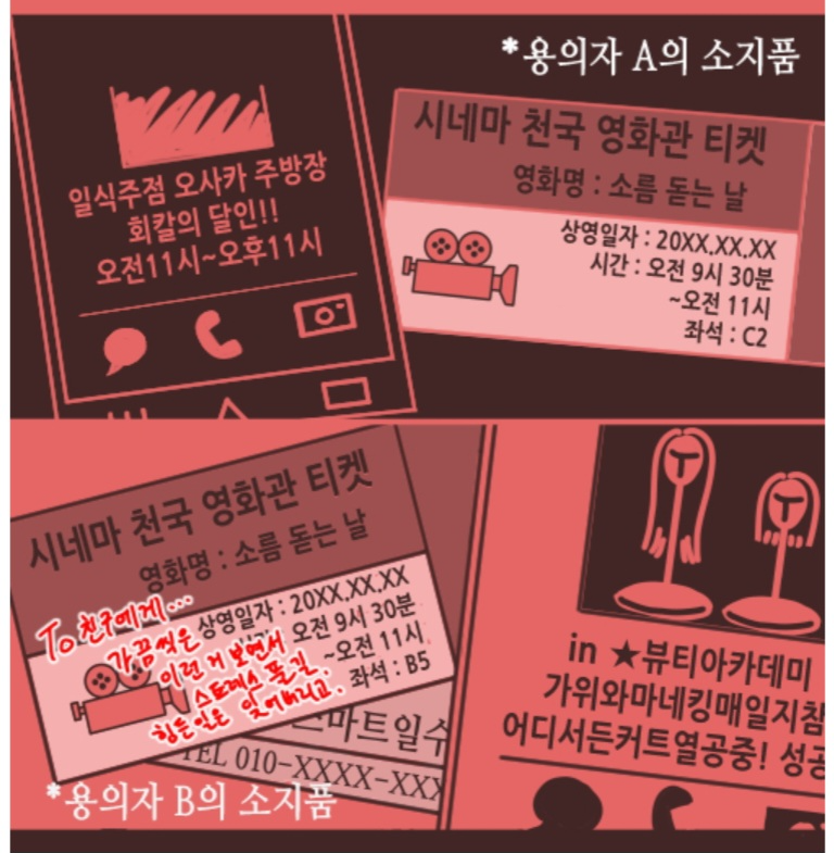 두번째로 제외 되는 용의자는 B다. B의 티켓을 보면 친구에게 영화 티켓을 선물 받은 것을 알 수 있다. B가 이 영화관에 있는 것 자체가 우연이기 때문에 용의 선상에서 제외시킬 수 있다.